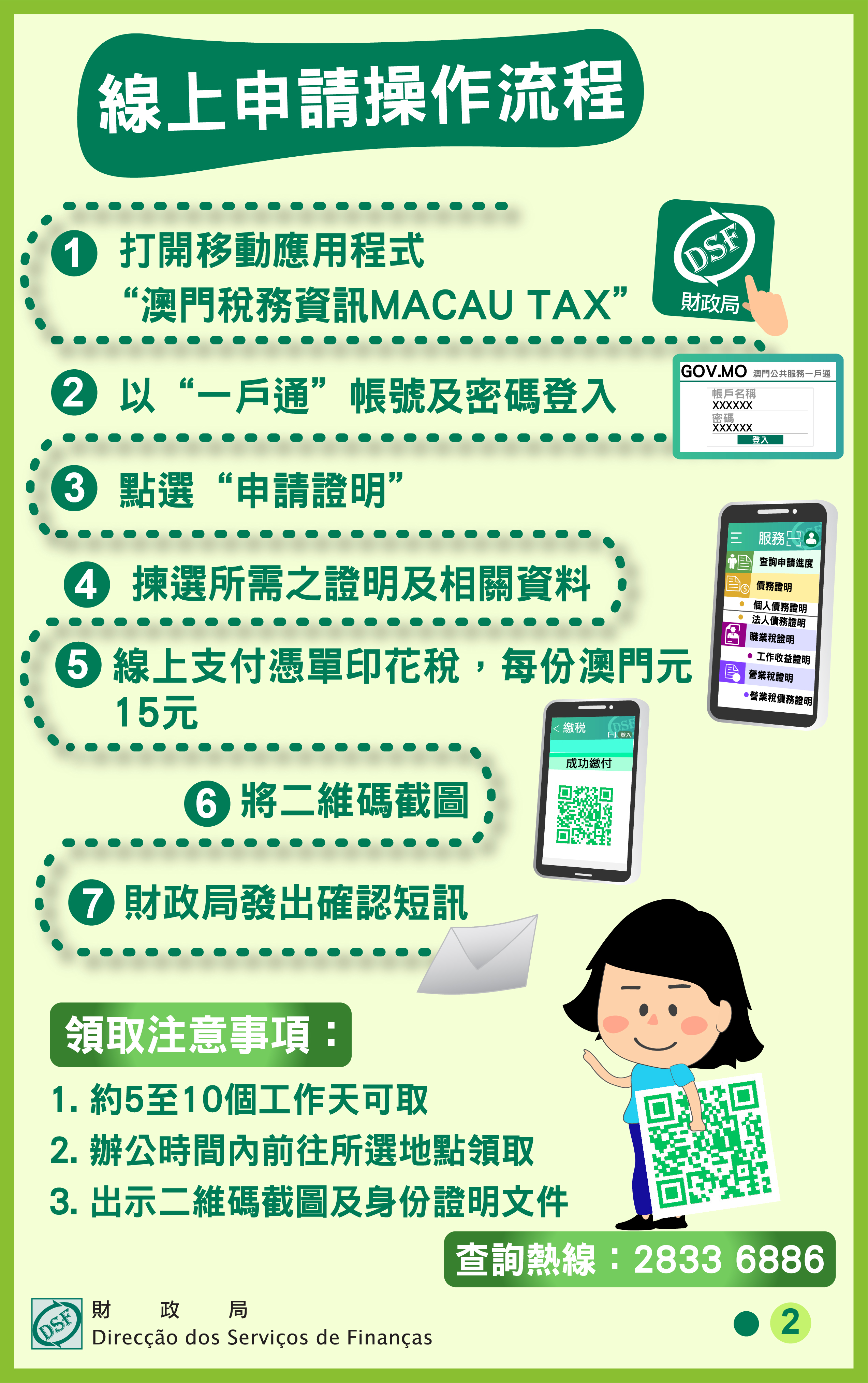 市民只需使用“一戶通” 帳號及密碼登入財政局移動應用程式“澳門稅務資訊Macau Tax”,按序點選申請證明的所需資料、申請份數,揀選領取地點,並透過政付通平台、大西洋銀行(BNU APP)或MPay任一電子支付方式線上支付申請證明需繳納的每份澳門元15元憑單印花稅,便會即時收到由財政局發出的確認短訊。