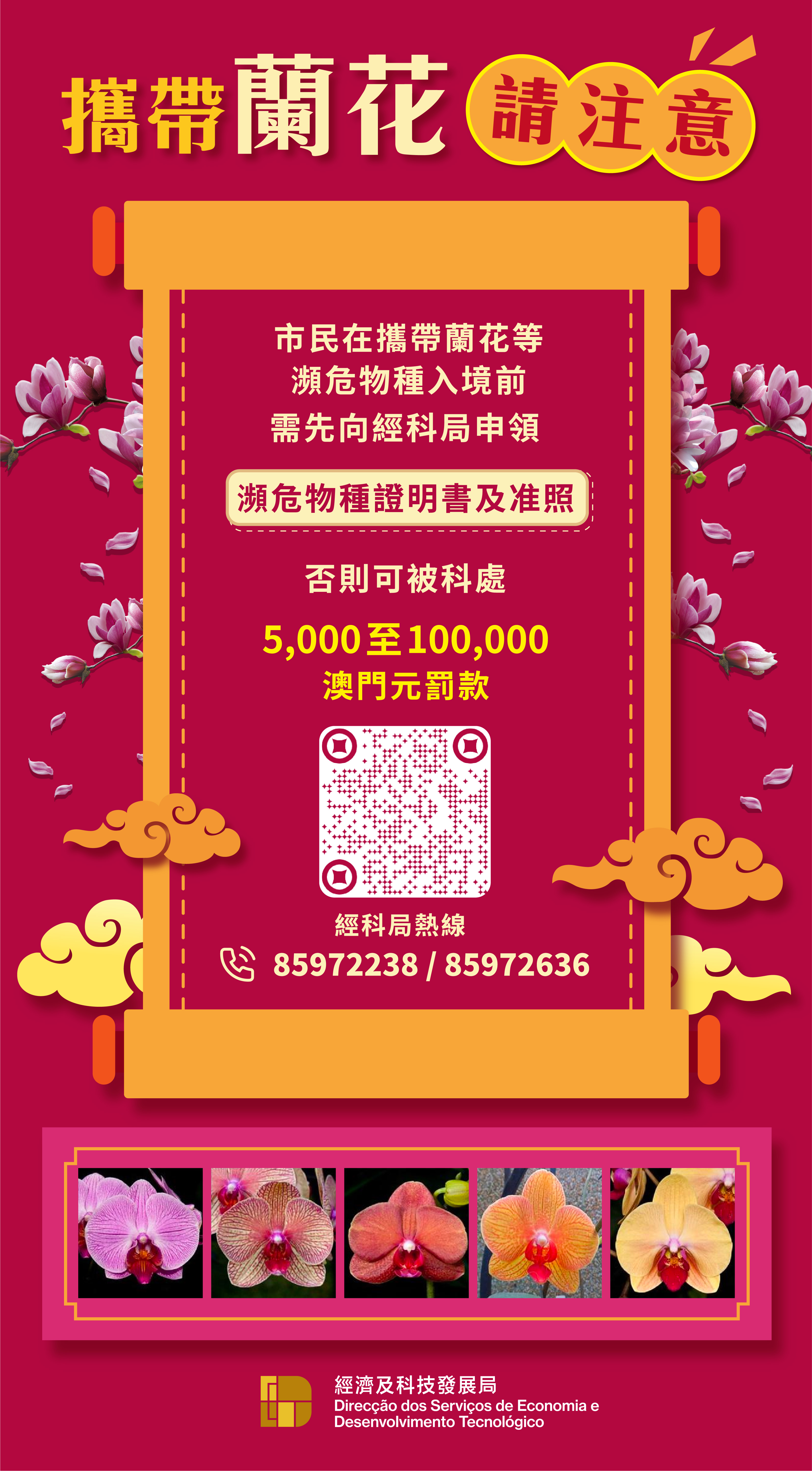 農曆新年將至,巿民常會從內地購買年花回澳。經濟及科技發展局提醒,市民在攜帶蘭花等瀕危物種入境前,需先向經科局申領瀕危物種證明書及准照,否則可被科處最少5,000澳門元罰款。