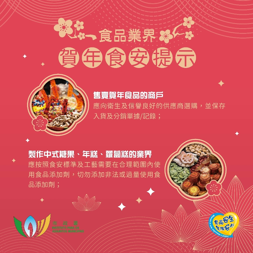市政署亦已於食品安全資訊網 www.foodsafety.gov.mo 及食安資訊手機應用程式開設“賀年食安資訊”專頁,歡迎業界及市民查閱相關食安操作指引及資訊。