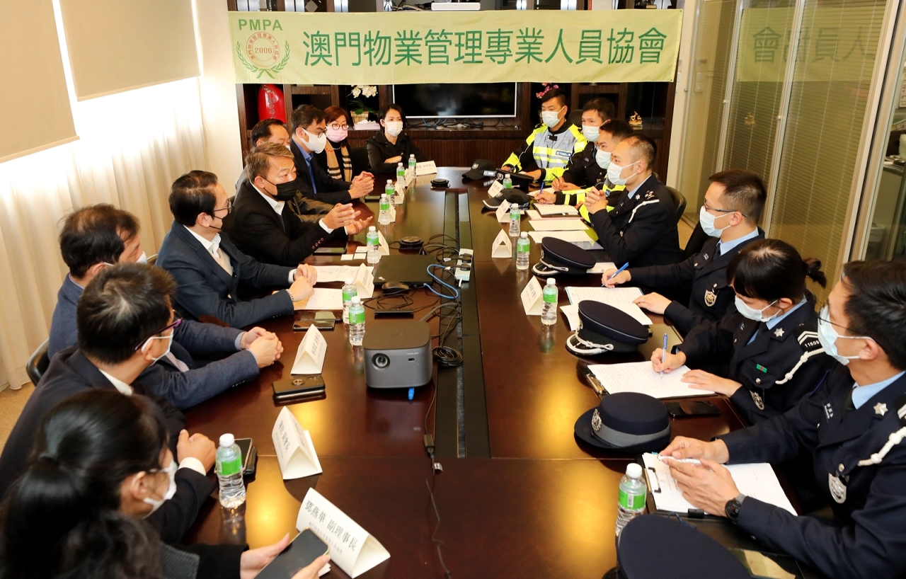 為持續優化「社區警務聯絡機制」,以及聽取社團代表對治安、交通、冬防工作等方面的意見和建議。於本月上旬,治安警察局策劃行動廳馬超雄代廳長、公共關係處李德輝處長及林強警司、澳門警務廳西南區警務處蔣少鑫代處長及交通廳交通偵查及支援處黃志宏代處長等多名主管,分別拜訪澳門社會民生促進會、澳門工會聯合總會、澳門街坊會聯合總會、澳門歸僑總會、民眾建澳聯盟、澳門物業管理專業人員協會、澳門婦女聯合總會、澳門餐飲業聯合商會、澳門中華新青年協會及澳門中華學生聯合總會。當中澳門社會民生促進會陳溥森會長、澳門工會聯合總會馮家輝副會長、澳門街坊會聯合總會陳家良理事長、澳門歸僑總會趙文炎副會長、民眾建澳聯盟歐陽廣球副理事長、澳門物業管理專業人員協會周嘉進會長、澳門婦女聯合總會吳嘉婷副理事長、澳門餐飲業聯合商會李汝榮理事長、澳門中華新青年協會劉佐春副會長及澳門中華學生聯合總會繆敏立副理事長與多位社團代表出席會議。
