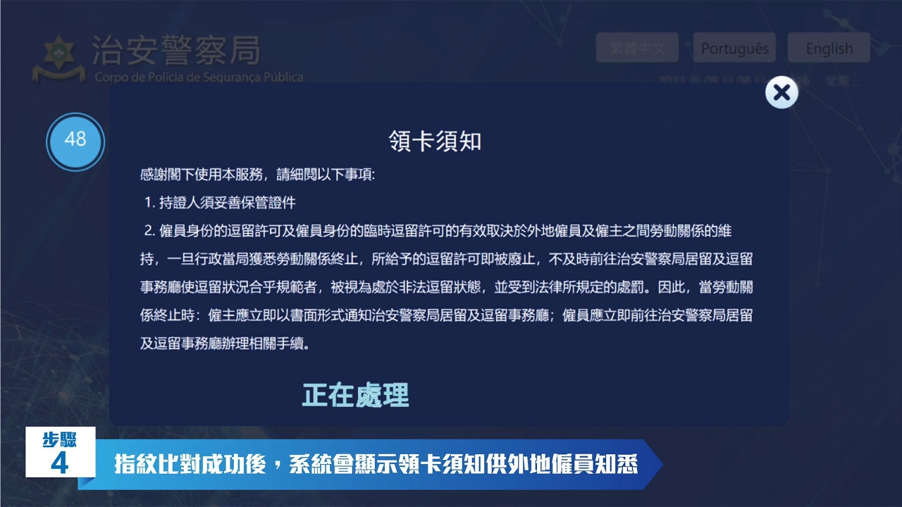治安警察局將繼續全力配合特區政府推動智慧警務,持續開發更多自助服務,為居民和外地僱員提供更多便利。公眾如欲查詢詳細資料,可瀏覽治安警察局網頁或官方微信號(CPSPMacaocn),亦可於辦公時間親臨三個服務地點(北安出入境事務大樓、澳門政府綜合服務大樓或離島政府綜合服務中心),或致電服務熱線28725488。