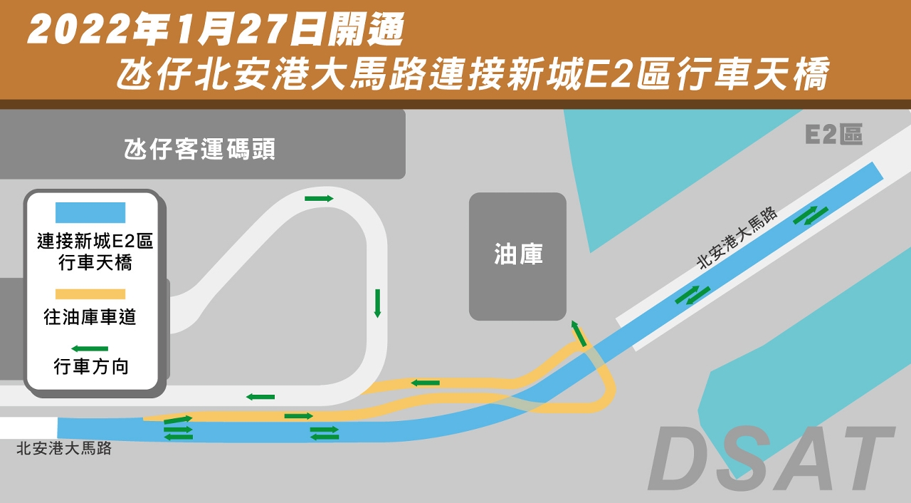 因應氹仔北安港大馬路連接新城E2區天橋及道路建造工程已完工並完成驗收程序,交通事務局將於1月27日(周四)上午10時半開通該行車天橋及相關道路,屆時由北安圓形地及北安港大馬路往返E2填海區必須經由新天橋及相關道路進出,不能經由現時的地面車道進出。