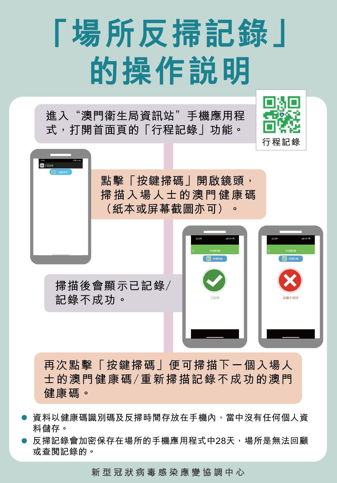 應變協調中心強調,透過「反掃」入場人士所出示有效的「澳門健康碼」,入場人士的入場記錄只會在場所的工作手機或其他電子設備內保存28天,資料僅包括健康碼識別碼及反掃時間,場所無法回顧或查閱記錄。同時,只有當疫情防控需要時,衛生局才會要求陽性病例到過的風險場所上傳「反掃」記錄予衛生局。屆時,場所負責人輸入場所代碼及由衛生局提供的密碼,按「提交設備前28天內掃描健康碼記錄」才可上傳記錄給衛生局。