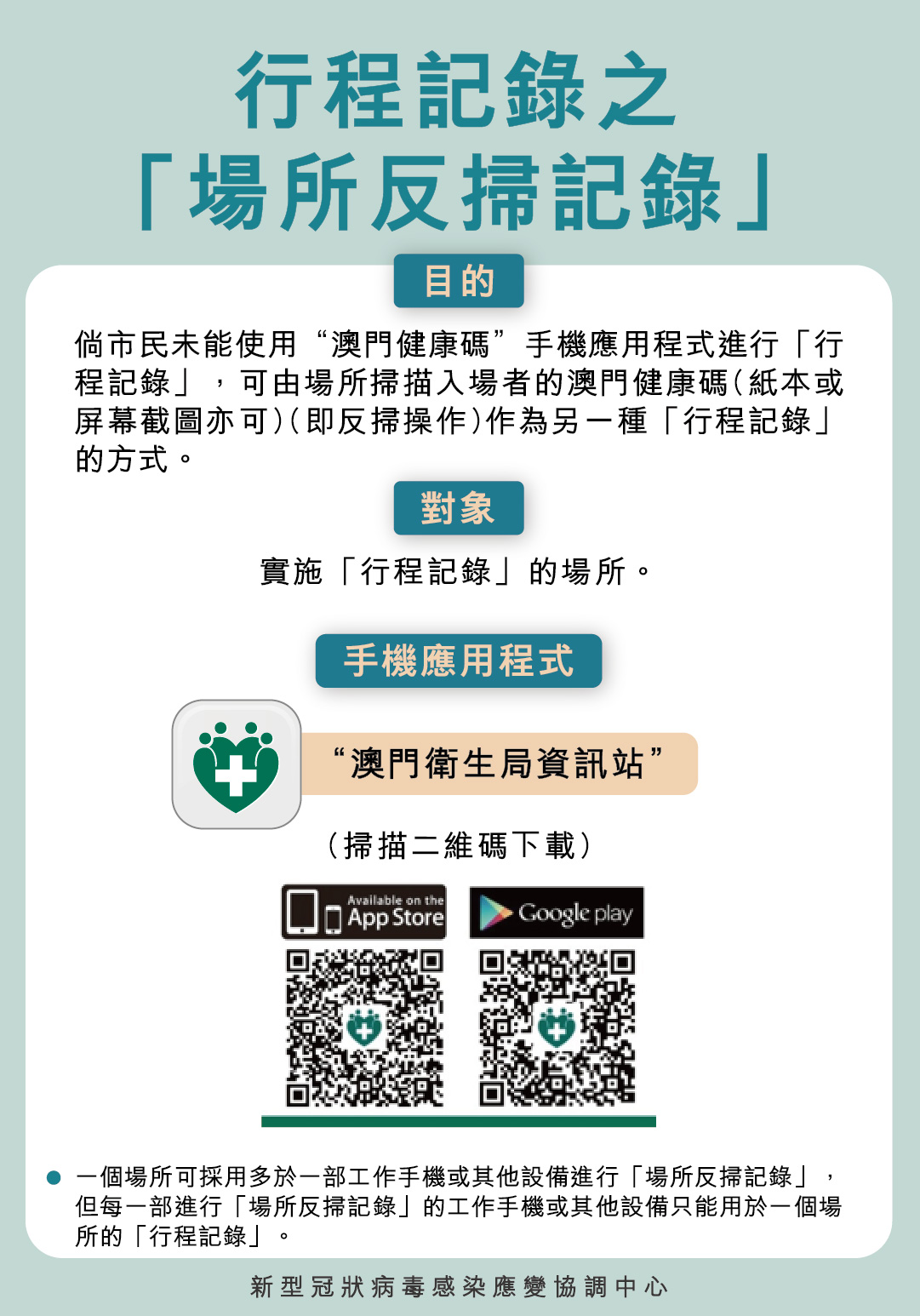 新型冠狀病毒感染應變協調中心(下稱應變協調中心)再次呼籲公眾進入公共場所作出行程記錄,倘未能使用「澳門健康碼」手機應用程式進行「行程記錄」,可由場所掃描入場者的澳門健康碼(紙本或屏幕截圖亦可),即「反掃」操作,作為另一種「行程記錄」的方式。一個場所可採用多於一部工作手機或其他設備進行「反掃」,但每一部進行「反掃」的工作手機或其他設備只能用於一個場所的「行程記錄」。「反掃」系統是設置在「衛生局資訊站」應用程式內,由場所自行下載及安裝在手機或其他設備上。
