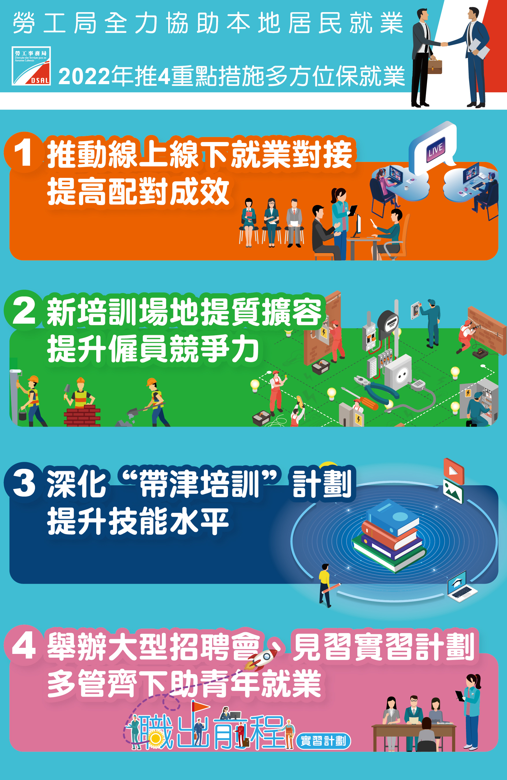 為應對即將投入職場青年新力軍的就業需求,勞工局將會協調不同領域的企業,推出一系列為青年特設的大型招聘會,並繼續舉辦“職出前程實習計劃”,為近年大學畢業的澳門青年提供實習機會。
