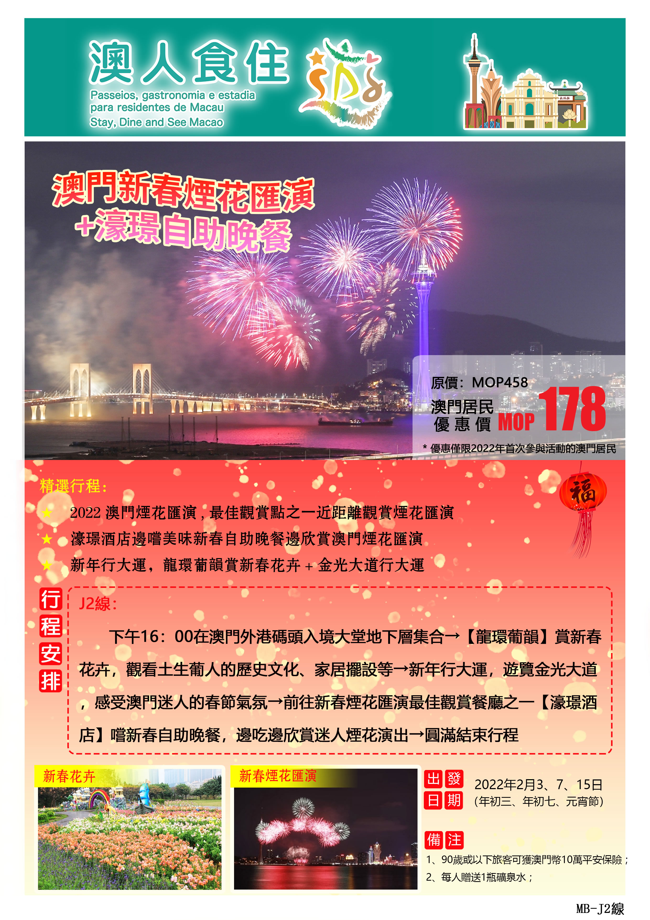 觀光船上看 – 在海上遊的觀光船上享用自助晚餐,同時近距離觀賞煙花表演,感受瞬間震撼;並到澳門八景之一的“龍環葡韻”欣賞春節花卉及“龍環葡韻住宅式博物館”了解土生葡人文化。