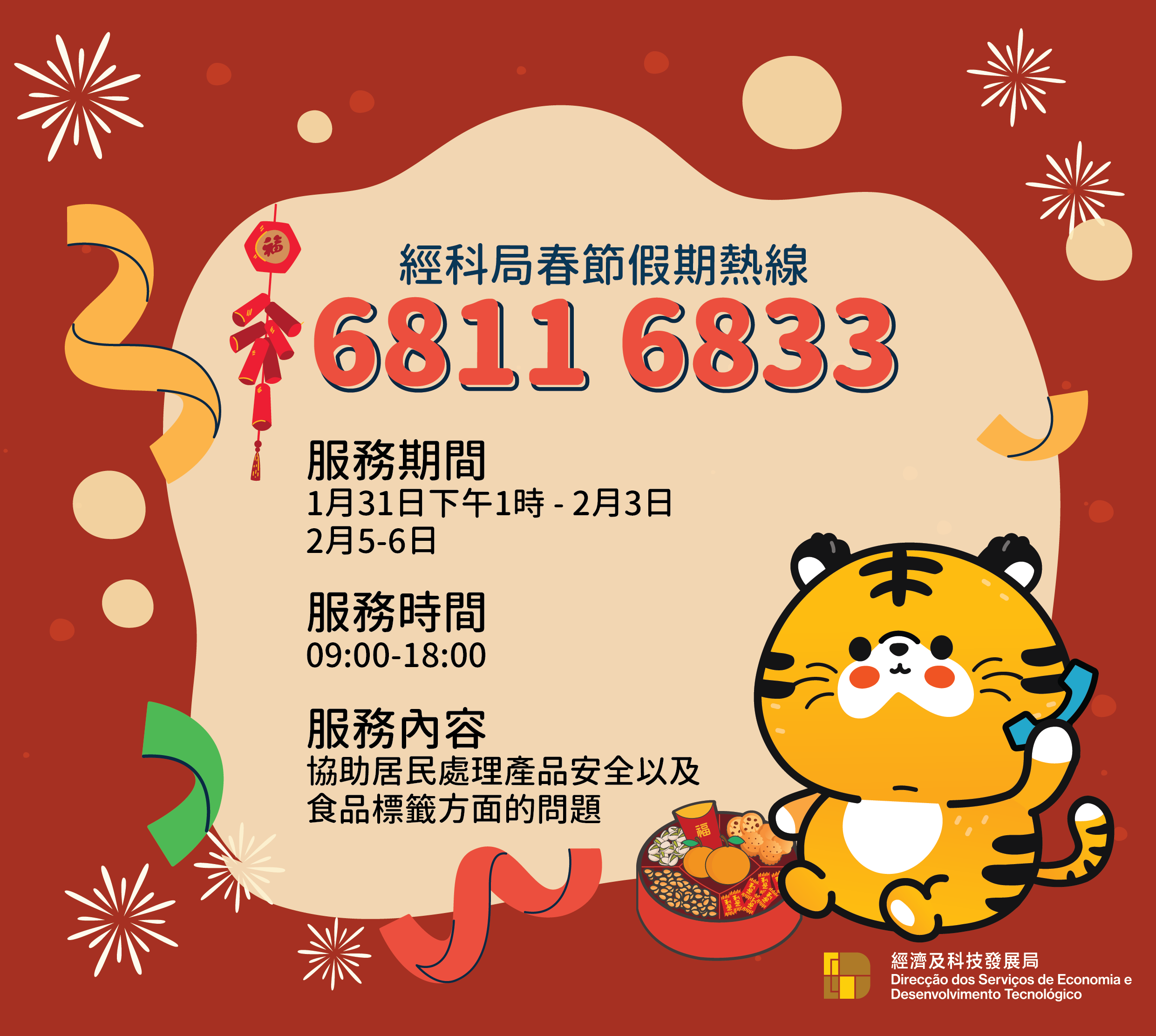 經濟及科技發展局於公眾假日期間(1月31日下午1時起至2月3日,2月5日至6日)設服務熱線6811 6833,協助居民處理產品安全以及食品標籤方面的問題。若居民對產品安全存有疑問、或發現商戶刪改食品標籤、售賣過期食品等情況,可於上述期間的上午9時至下午6時致電服務熱線,經科局將派員跟進處理。而2月4日是正常辦公日,經科局將如常提供公眾服務。