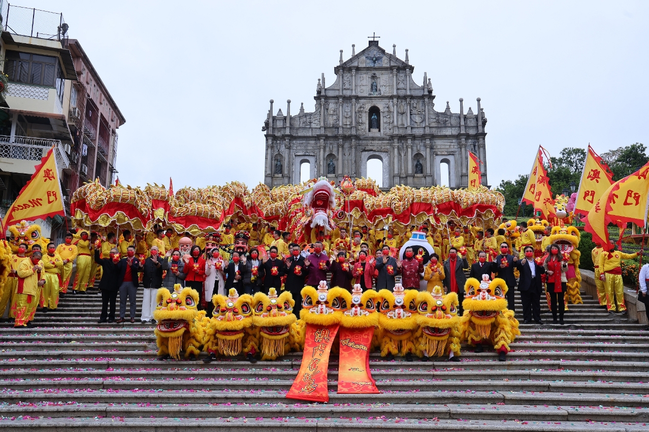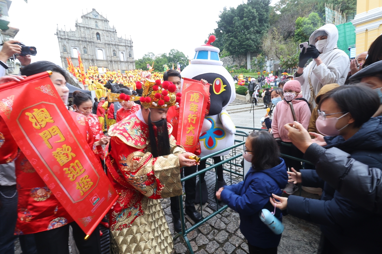 旅遊局局長文綺華、市政署市政管理委員會主席戴祖義、文化局局長梁惠敏、旅遊局副局長程衛東及許耀明,以及旅遊業界代表等,於大年初一早上在大三巴牌坊向大家拜年,並主持大金龍和醒獅點睛儀式。財神、福祿壽三星、金童玉女、虎生肖及“麥麥”向市民和旅客拜年及派送金元寶,寓意澳門繁榮興旺、財源廣進。現場氣氛喜氣洋洋,各人互送祝福。