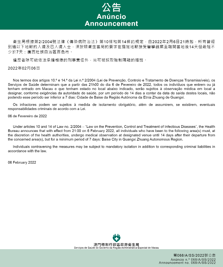 新型冠狀病毒感染應變協調中心(下稱應變協調中心)宣佈,因應廣西壯族自治區的疫情變化,衛生局根據第2/2004號法律《傳染病防治法》第10條和第14條的規定,自2022年2月6日晚上9時起,所有曾經到過以下地點的入境及已入境人士,須按照衛生當局的要求在指定地點接受醫學觀察至離開當地後14天但最短不少於7天:廣西壯族自治區百色市。