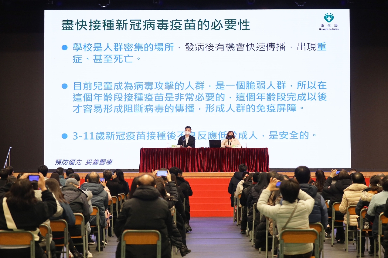 講解會上,羅奕龍向學校負責人和代表介紹本澳疫苗接種情況,引用科學數據和研究結果,表明新冠疫苗能有效減低重症與死亡率,並關注變異病毒株Omicron對本澳社會存在的風險,以及對未成年人染疫後造成的嚴重後果,呼籲學校和家長協力為保護學生和子女的健康,儘快安排接種疫苗。教青局非高等教育廳代廳長張子軒、疾病預防及控制中心傳染病防控處高級技術員盧奧利分別向與會者介紹推動學生接種疫苗的學校實務操作、疫苗接種的好處與誤解,以及各種新冠疫苗的有效性和安全性等。
