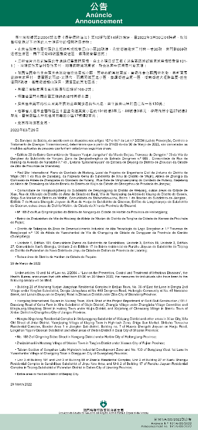 新型冠狀病毒感染應變協調中心(下稱應變協調中心)宣佈,因應內地的疫情變化,衛生局根據第2/2004號法律《傳染病防治法》第10條和第14條的規定,自2022年3月30日凌晨1時起,所有曾經到過以下地點的入境及已入境人士,須按照衛生當局的要求在指定地點接受醫學觀察至離開當地後14天但最短不少於7天:安徽省蕪湖市繁昌區的新城華府小區1號樓、陽光花園C區14棟、棲霞社區31棟、新港鎮建華建材職工宿舍5棟;福建省泉州市洛江區萬安街道吉源雅苑1號樓;湖南省長沙市雨花區東塘街道楓樹山社區;廣東省肇慶市高要區金利鎮的永利工業園內永順路1至35號連片區域、羅客村。