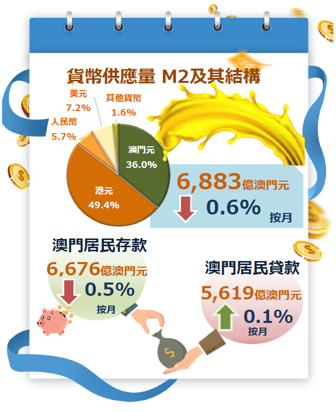 流通貨幣及活期存款分別減少4.0%及0.7%,M1因而較上月下跌1.7%。與此同時,準貨幣負債減少0.4%,因此包括M1及準貨幣負債的廣義貨幣供應量M2遂按月回落0.6%,金額為6,883億澳門元。若與2021年同期比較,M1及M2分別下跌2.0%及1.1%。按幣種分析,澳門元、港元、人民幣及美元在M2的比重分別為36.0%、49.4%、5.7%及7.2%。