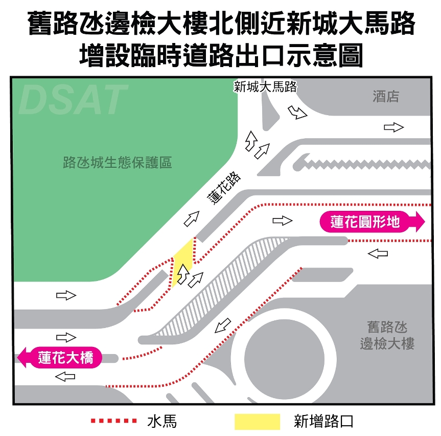 為配合路氹蓮花路及蓮花圓形地周邊的多項大型工程,及疏導蓮花圓形地的車流,舊路氹邊檢大樓北側靠新城大馬路的位置,將增設臨時道路出口,以便由橫琴口岸經蓮花大橋前往氹仔方向之車輛,可直接經由新城大馬路駛往路氹城一帶。新增之臨時道路出口將於4月9日(周六)完成地面標線工作及設置水馬後,隨即開放通行。