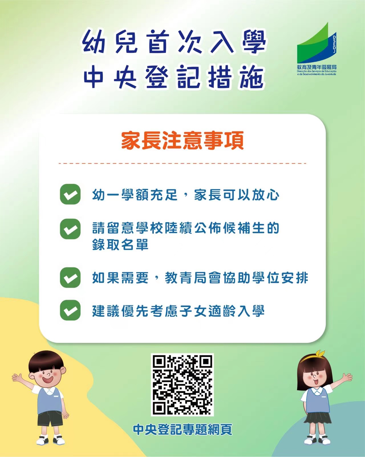 為進一步便利家長辦理幼兒首次入學的手續,教育及青年發展局已推出“首次入學二維碼”。已完成中央登記的家長於4月30日或之前,登入教青局“幼兒首次入學中央登記措施”專題網頁(www.dsedj.gov.mo)取得“首次入學二維碼”。