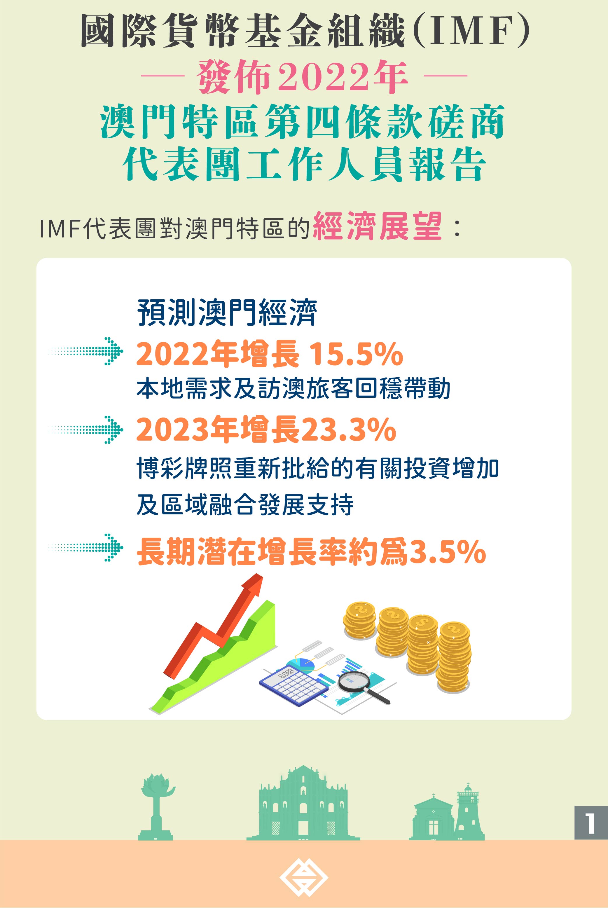 國際貨幣基金組織(IMF)總結2022年澳門特別行政區的第四條款磋商,並於今(13)日發佈代表團工作人員報告。代表團肯定澳門特區政府有效運用財政資源減輕疫情對經濟造成的負面影響,預測澳門今年經濟增長15.5%,明年經濟增長23.3%。