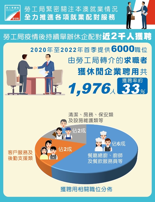 勞工局一直與各休企密切聯繫,持續推出各種職位空缺,透過不同形式的配對活動,為求職者提供配對服務。2020年至今年首3個月,休企已提供近6,000個空缺予勞工局轉介,並已協助1,976名求職者獲聘,獲聘率約33%。
