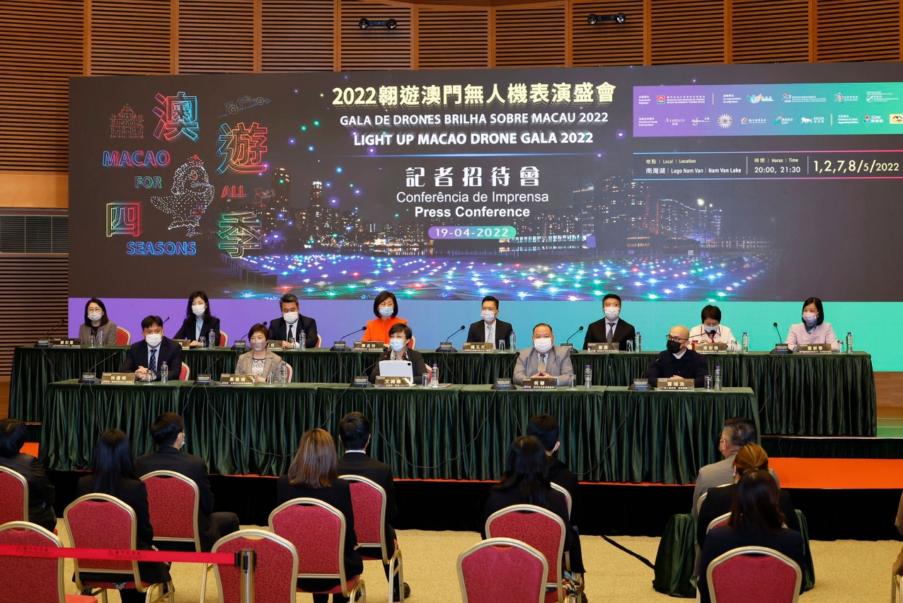 “2022翱遊澳門無人機表演盛會”記者會今(19日)召開,旅遊局局長文綺華在會上致辭。活動的協辦單位和活動合作伙伴等代表出席記者會。