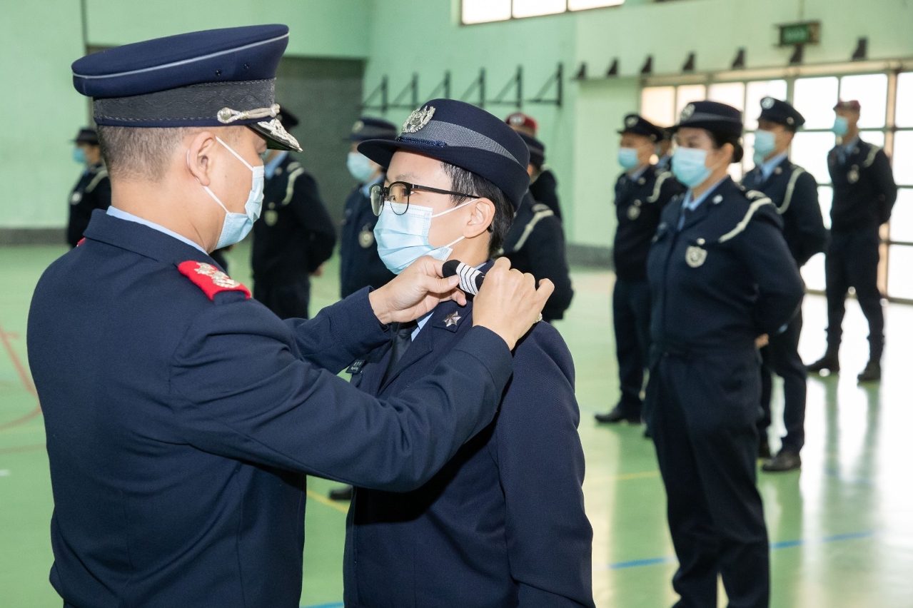 今(20)日上午,治安警察局在特警隊大樓舉行首席警員晉升儀式,儀式由吳錦華局長主持,還有黃偉鴻副局長、梁慶康副局長、伍素萍副局長及各部門的主管出席儀式,為獲晉升的首席警員戴上新肩章,並作出祝賀。