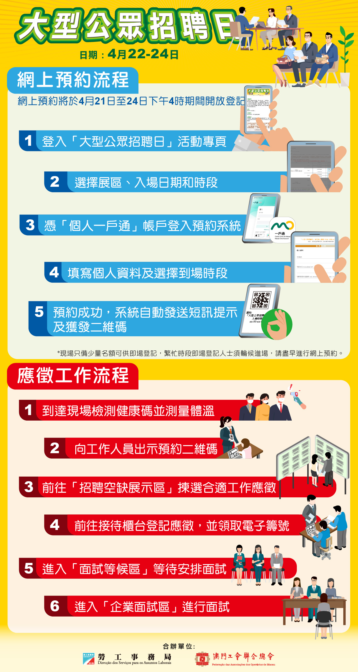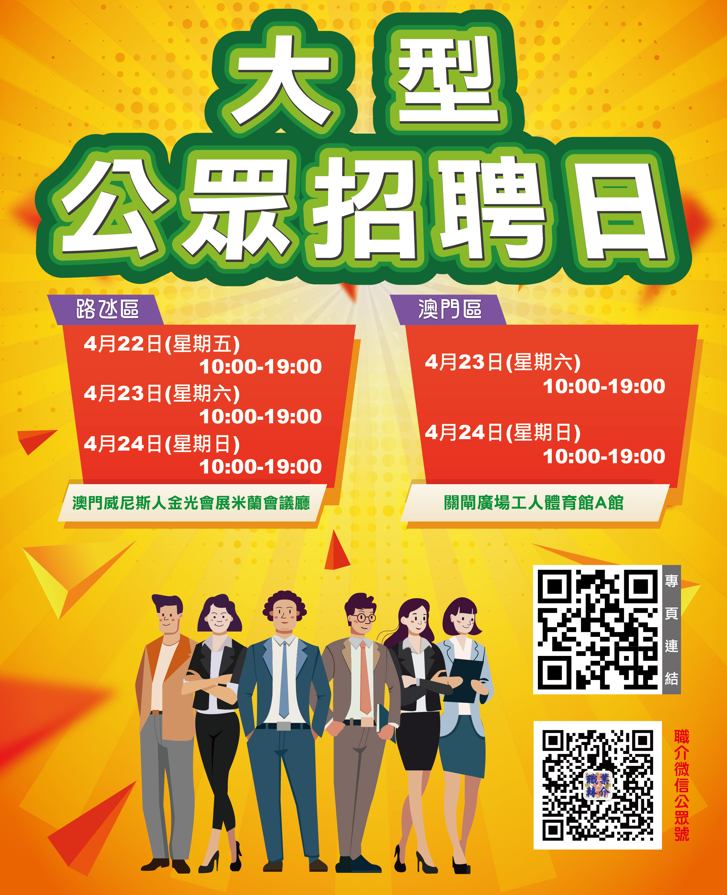 勞工局與工聯總會由周五起(4月22日),一連3日聯合舉辦「大型公眾招聘日」,分別在澳門區(關閘廣場工人體育館A館)及路氹區(威尼斯人金光會展米蘭會議廳)設有場館,活動首日(22日)先於威尼斯人金光會展舉行,其後兩日(23日及24日)會增加關閘工人體育館展區。