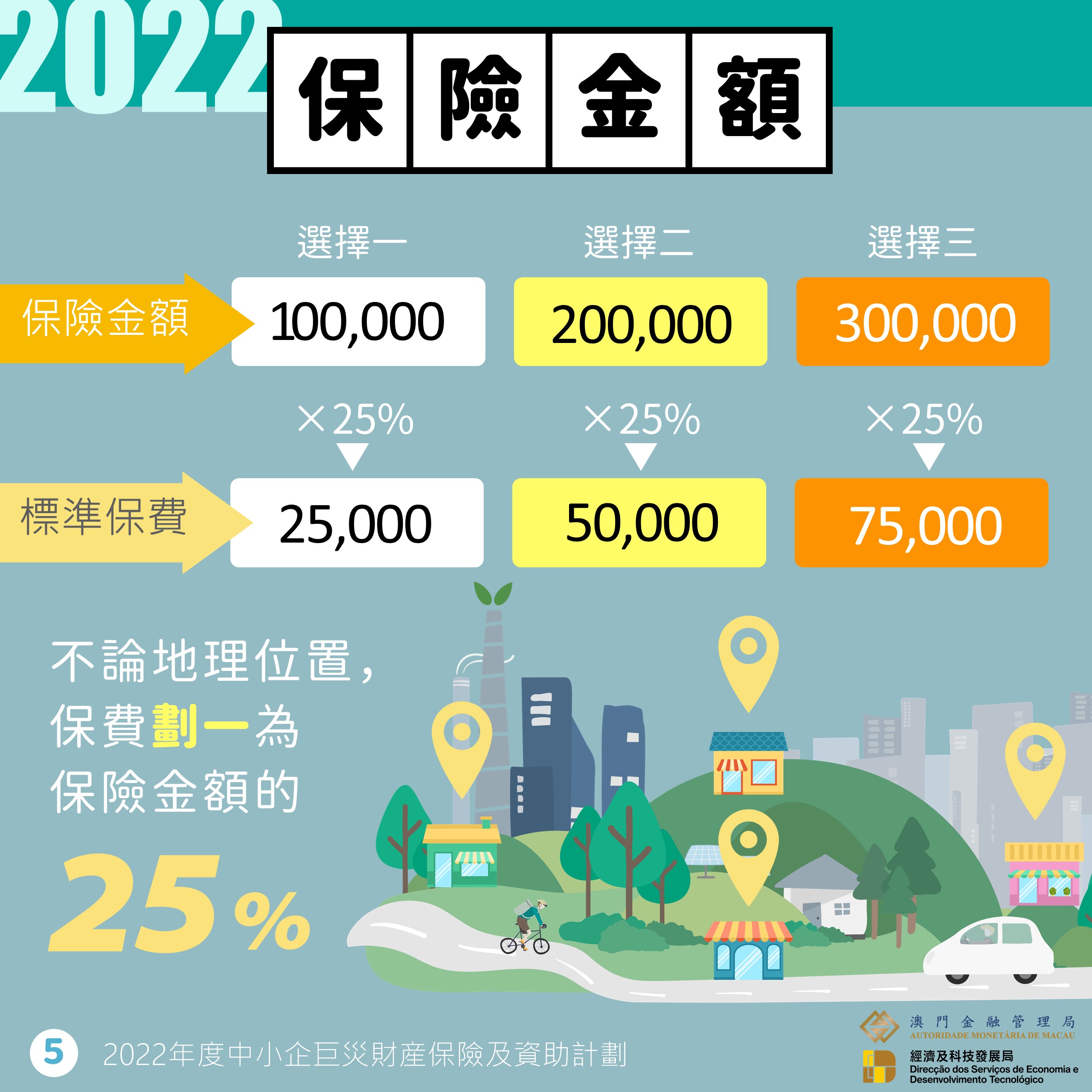 中小企可透過參與的五間本地保險公司,為每一營業場所投保一份巨災保險,保險金額可選擇10萬(澳門元,下同)、20萬或30萬,對應標準保費為25,000、50,000及75,000;未曾索償的續保商戶可繼續享有保費折扣,第一年續保有20%的折扣優惠,第二年為25%、第三年為30%、第四年或以上為35%。希望鼓勵商戶能持續投保,以管理自身風險。