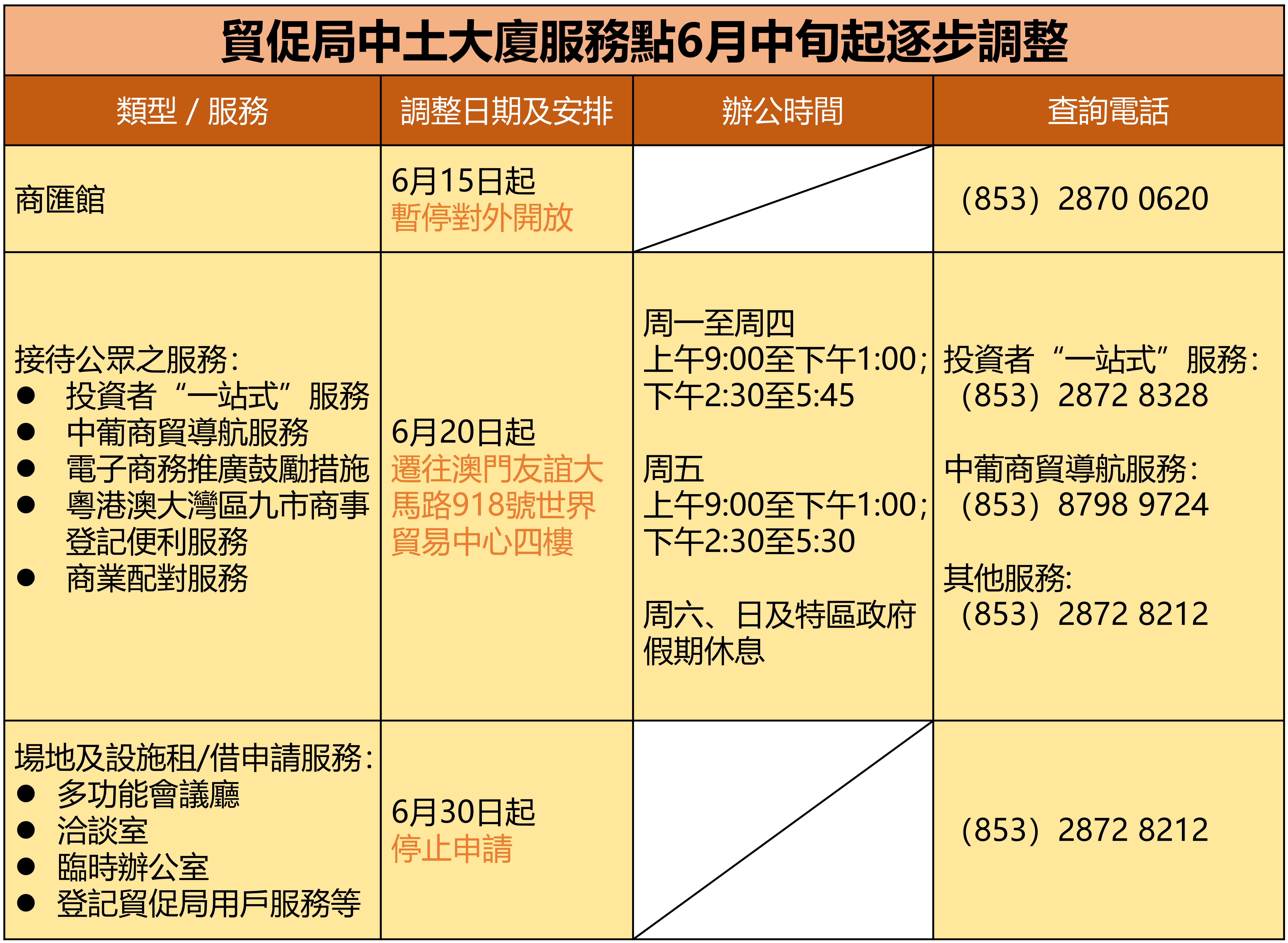 3.場地及設施租/借申請服務,包括:多功能會議廳、洽談室、臨時辦公室、登記貿促局用戶服務,6月30日起停止申請。查詢電話:(853)2872 8212。