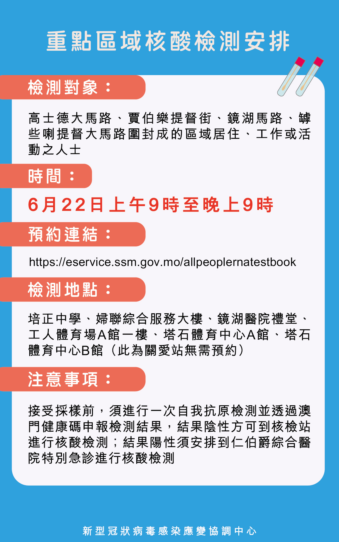 新型冠狀病毒感染應變協調中心公佈,為應對本澳6月18日至今出現的新型冠狀病毒肺炎疫情,在全民核酸檢測基礎上,針對重點區域及重點人群,進一步開展一次核酸檢測,以排除可能潛伏於本澳社區的新冠肺炎感染者。