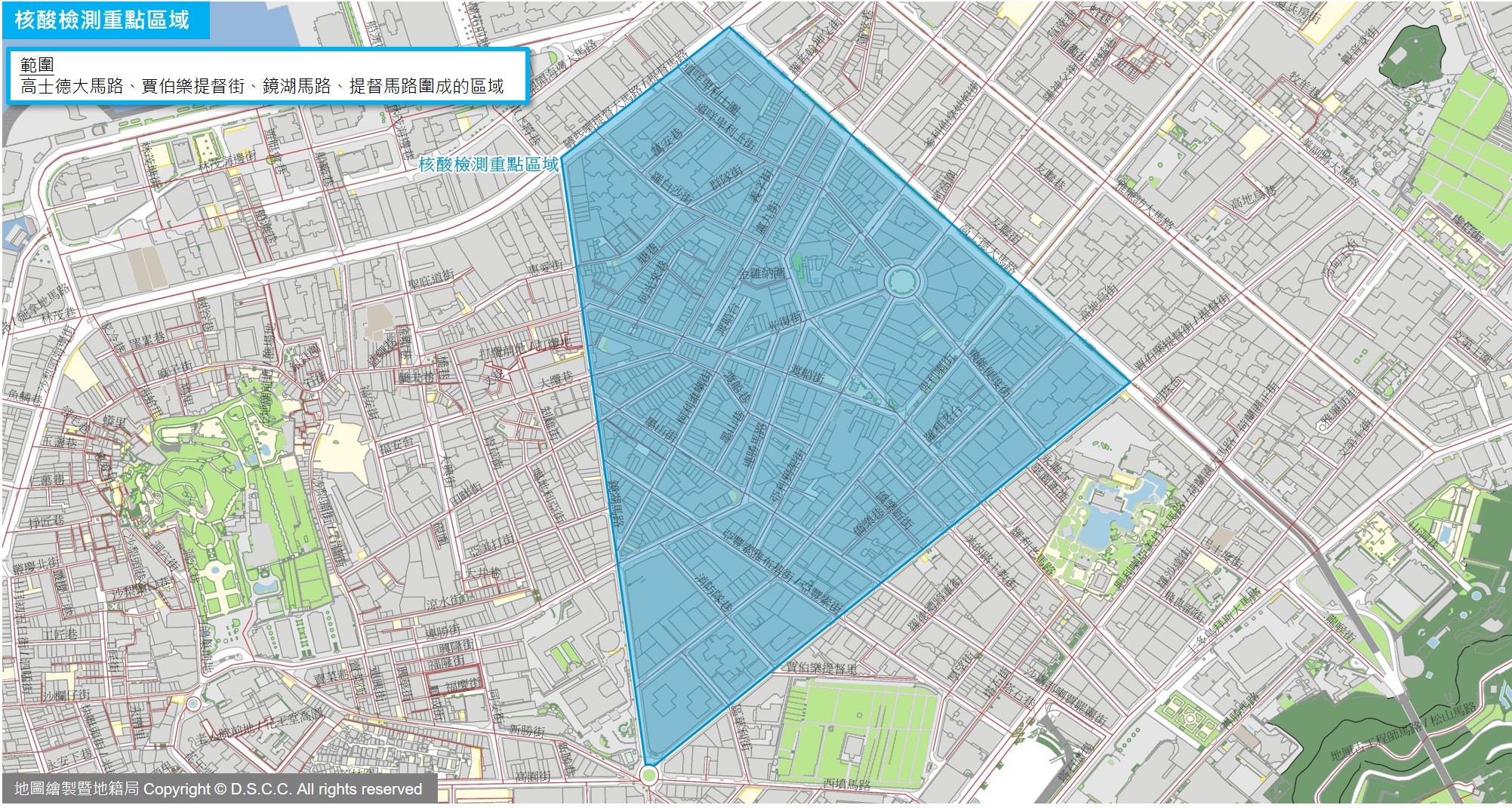 重點區域檢測對象包括:在高士德大馬路、賈伯樂提督街、鏡湖馬路、罅些喇提督大馬路圍封成的區域居住、工作或活動之人士,須於明(22)日上午9時至晚上9時期間透過以下連結:https://eservice.ssm.gov.mo/allpeoplernatestbook,預約到培正中學,婦聯綜合服務大樓,鏡湖醫院禮堂,工人體育場A館一樓和塔石體育中心A館進行核酸檢測,另設塔石體育中心B館為關愛站,無需預約。