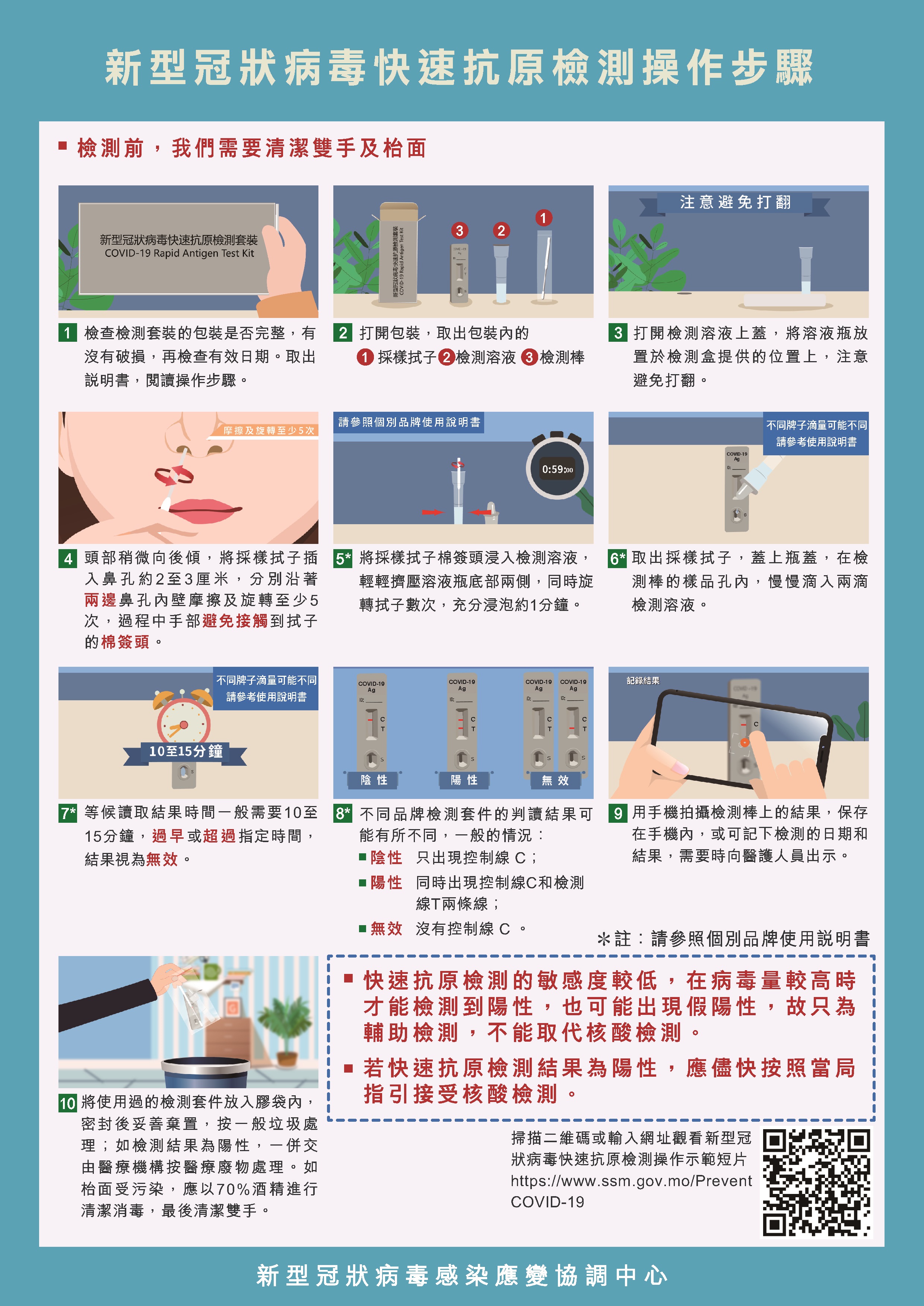 應變協調中心提醒,不同牌子的快速抗原檢測套裝操作步驟可能稍有不同,使用前須先閱讀套裝內的使用說明書,按操作程序進行檢測,並協助家中有需要人士,如長者,透過澳門健康碼申報檢測結果。快速抗原檢測操作步驟、結果申報及使用注意事項,詳見以下連結( https://www.ssm.gov.mo/apps1/covidagtest/ch.aspx#clg21987 )。