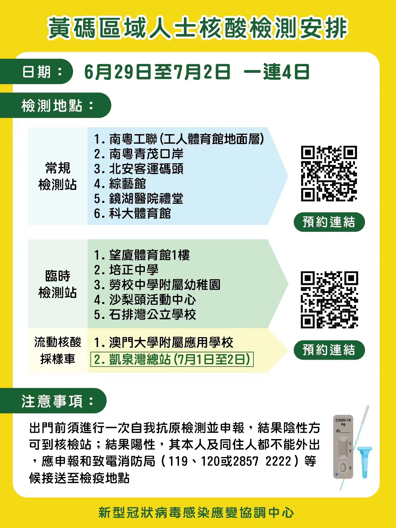 黃碼人士可透過以下連結:https://eservice.ssm.gov.mo/allpeoplernatestbook預約到上述地點進行核酸檢測,亦可在以下連結預約到各個常規核酸檢測站進行免費核酸檢測:https://app.ssm.gov.mo/mandatoryrnatestbook ,核酸檢測結果不會上載至澳門健康碼,亦不可作為出入境用途。