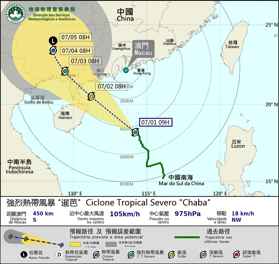 強烈熱帶風暴「暹芭」將向西北方向移動,大致趨向廣東西部至海南島一帶。由於預料受菲律賓以東的另一低壓區發展所影響,其強度及路徑未來仍存在較大變數,如「暹芭」採取較偏北路徑更接近本澳或於近岸加強,屆時不排除改發更高風球的機會。