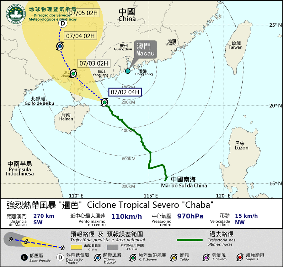 八號東南風球現正生效。強烈熱帶風暴「暹芭」預料將進一步增強為颱風,並向西北方向移動,大致趨向廣東西岸。預計「暹芭」於接下來數小時最接近本澳,本澳風力將繼續維持,吹8級烈風及有陣風。受「暹芭」雨帶影響,本澳間中有大驟雨及雷暴。
