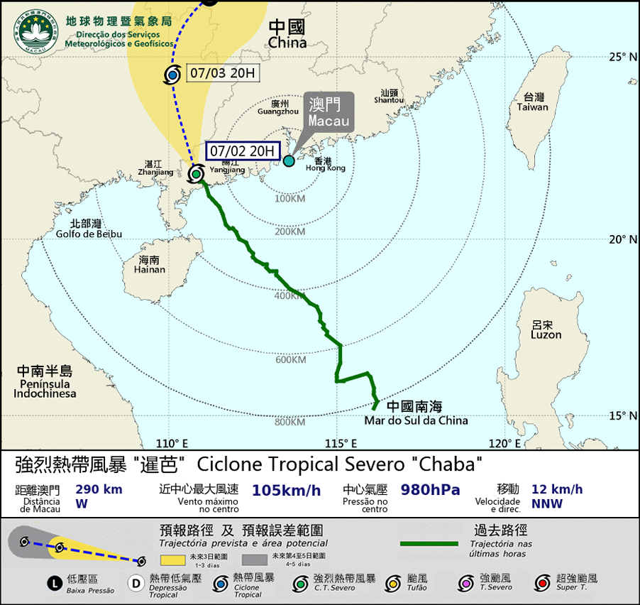 隨著「暹芭」逐漸減弱及遠離本澳,本澳風力已有所緩和。因此本局於20時30分改發三號風球。改發三號風球後,由於仍受到「暹芭」相關的環流影響,今晚至明早本澳廣泛地區仍吹強風,風力可達6至7級,天氣仍然不穩定,間中有狂風驟雨及雷暴,亦不排除有暴雨的情況,請市民保持警惕,並密切留意本局最新天氣資訊。