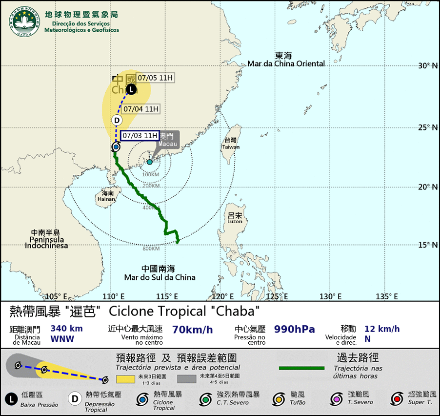 備註: 機率表提供未來一至兩天警告信號的可能情況,市民可藉此了解熱帶氣旋於指定時段內影響澳門的可能性,從而更早地妥善安排相應預防措施。請市民留意本局發佈的最新消息。