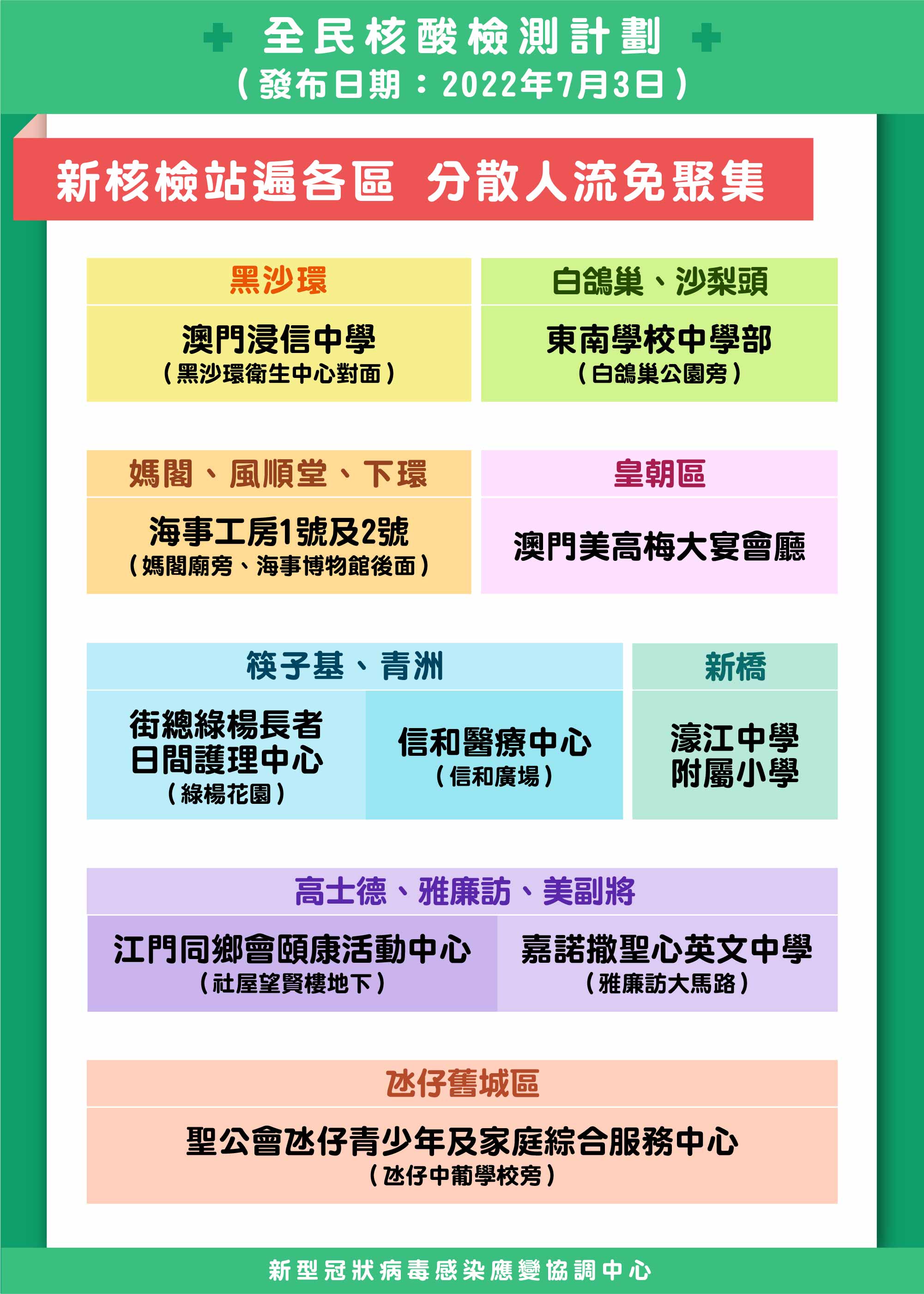 新型冠狀病毒感染應變協調中心(下稱應變協調中心)表示,第4輪全民核檢於今(4)日上午9時開始,各站點大致運作順暢。當中近期新增設的10個一般核檢站(澳門浸信中學、澳門江門同鄉會頤康活動中心、澳門街坊會聯會總會綠揚長者日間護理中心、信和醫療中心、嘉諾撒聖心英文中學、東南學校-中學部、澳門美高梅大宴會廳、海事工房1號及2號、聖公會氹仔青少年及家庭綜合服務中心以及濠江中學附屬小學),目前仍有大量預約名額,輪候時間較其他站點短,呼籲居民預約上述核檢站採樣,以分散人流避免聚集,減低感染風險。