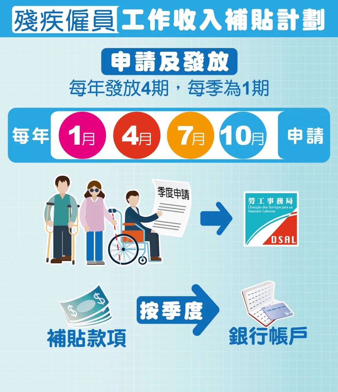 為支援殘疾人士就業,讓殘疾僱員獲得最基本的工資權益,特區政府於2020年11月1日推出《殘疾僱員工作收入補貼計劃》行政法規。根據有關規定,符合資格的殘疾僱員可由即日起至7月31日向勞工事務局申請2022年第二季的工作收入補貼。法規生效至今,勞工事務局已接收六個季度的申請,累計收到109份申請,其中共有103個個案符合發放津貼的要求獲發津貼,申請人主要從事保安及清潔服務業、製造業、美容業、零售業及社會福利等行業。
