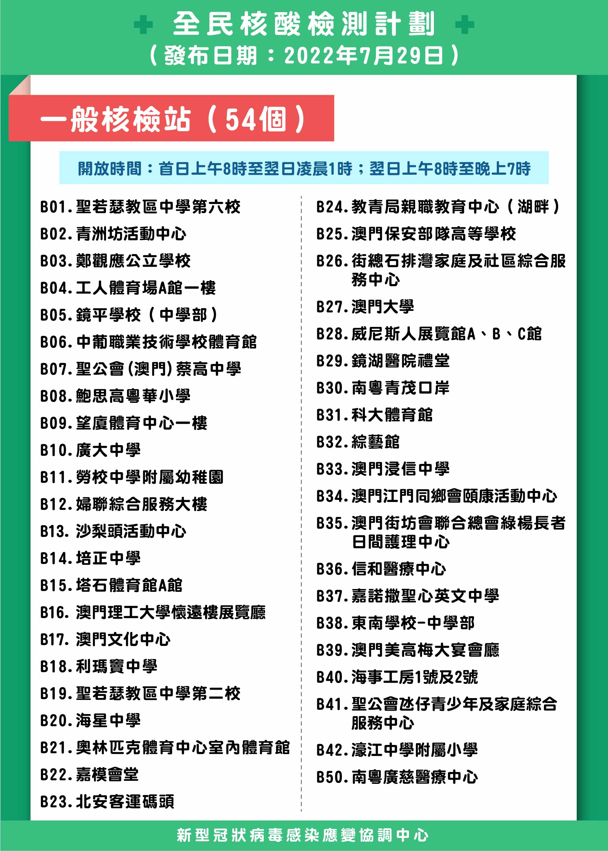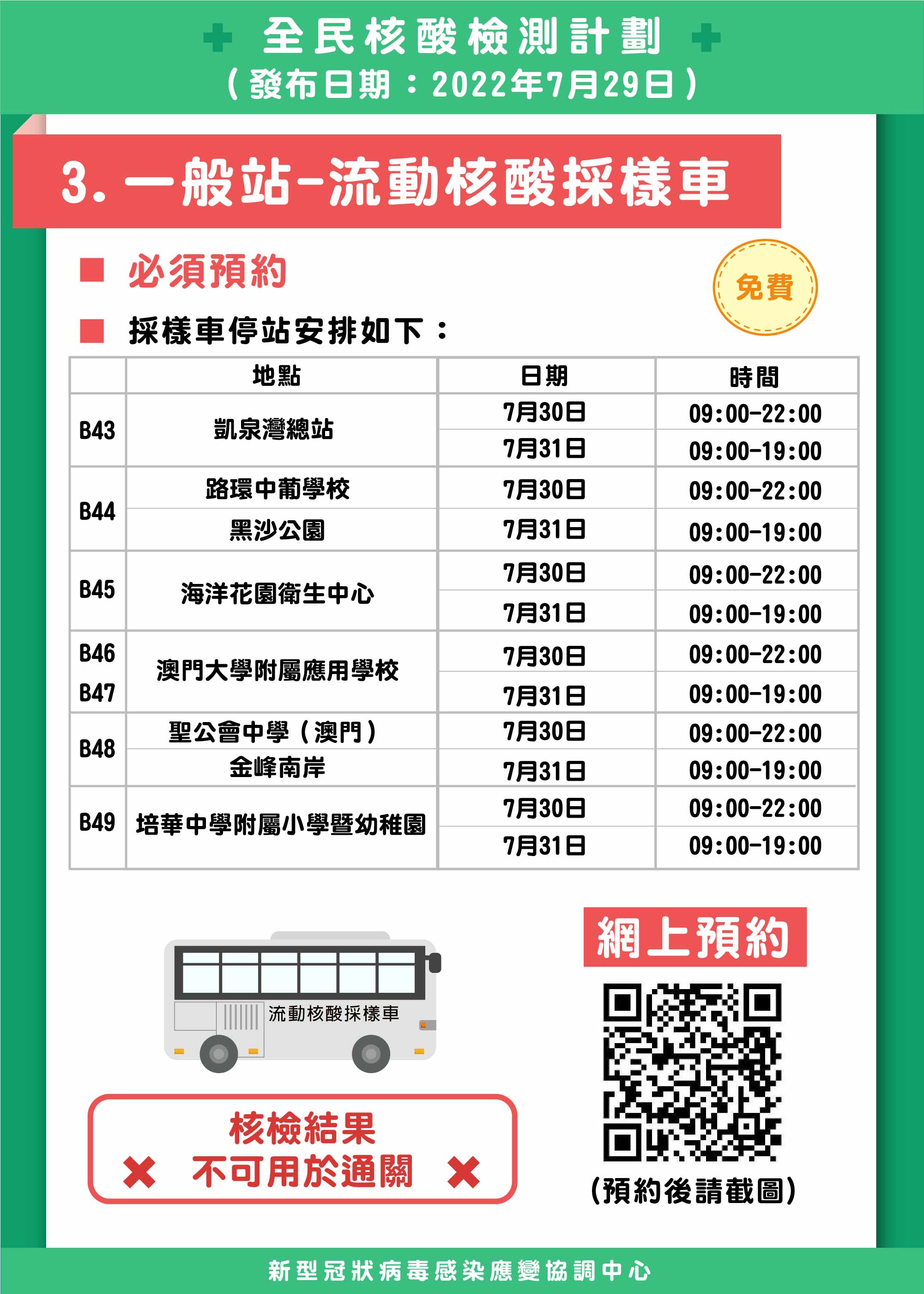 預約系統將於7月30日早上6時開通,可透過以下連結預約進行全民核檢,連結為https://eservice.ssm.gov.mo/allpeoplernatestbook ,檢測結果不可用作通關。