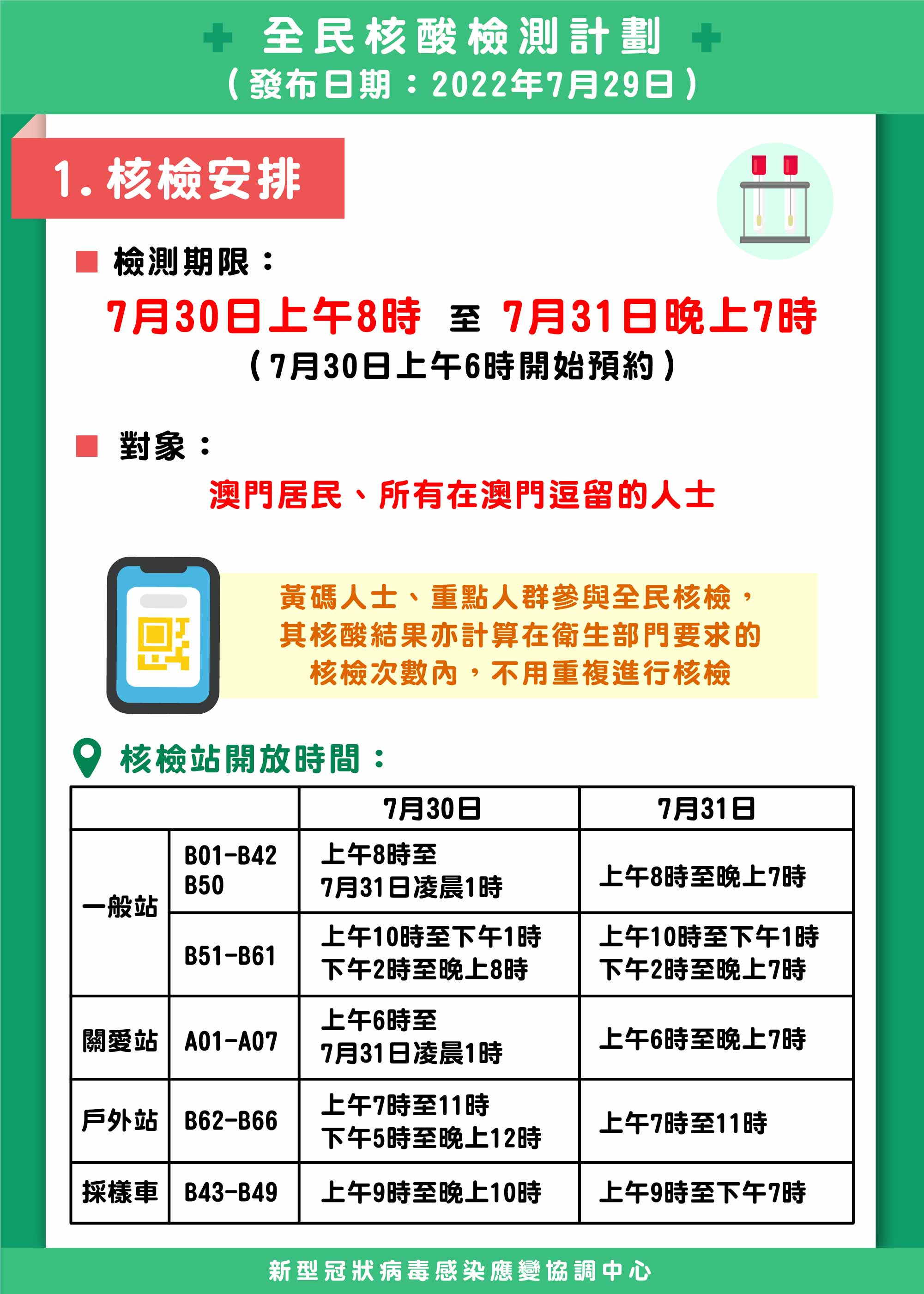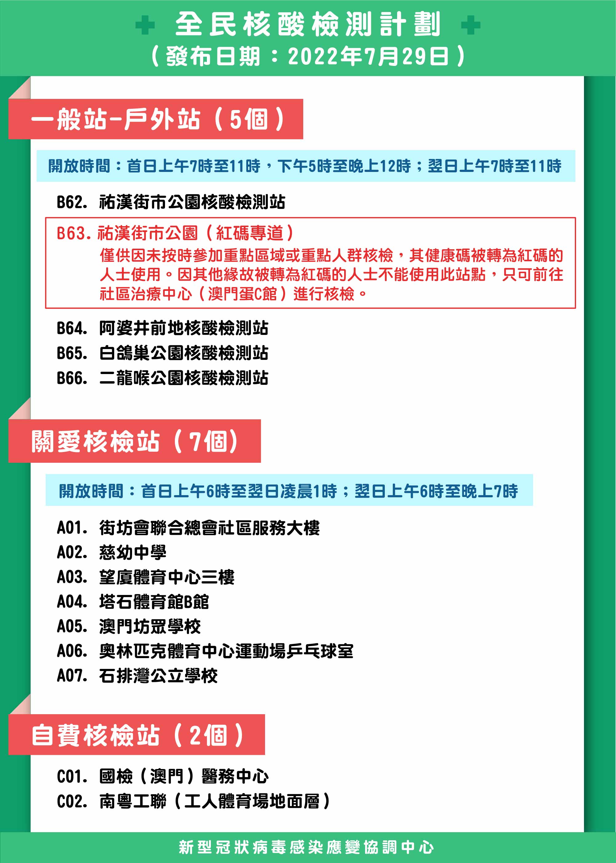 3. 5個戶外核檢站開放時間為7月30日早上7時至11時,下午5時至晚上12時,共兩個時段;7月31日早上7時至11時一個時段;當中祐漢街市公園核檢站設有紅碼專道,僅供因未按時參加重點區域或重點人群核檢,其澳門健康碼被轉為紅碼的人士使用;