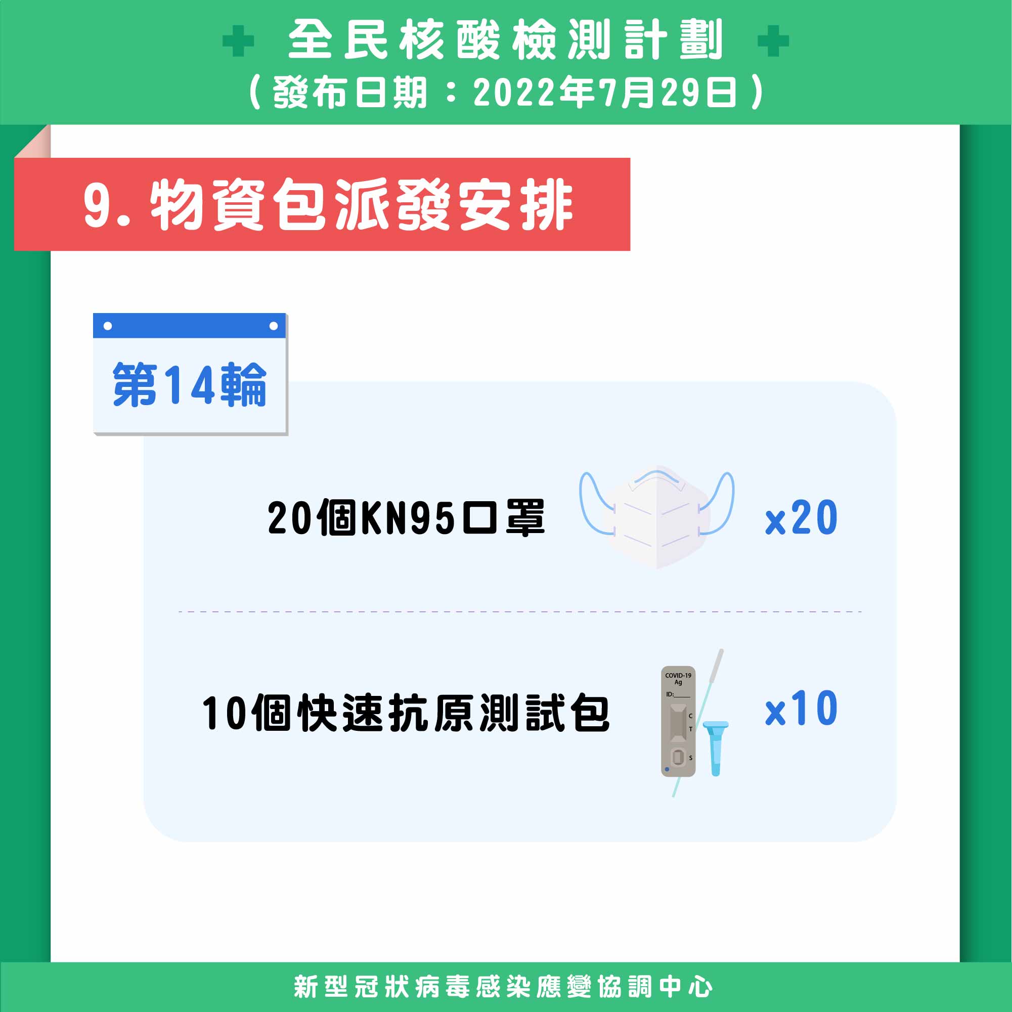 進行全民核檢時,每名居民可獲發10個快速抗原檢測套裝和20個KN95口罩,請居民自備購物袋領取相關防疫物資,並請留意領取安排,不設補領。