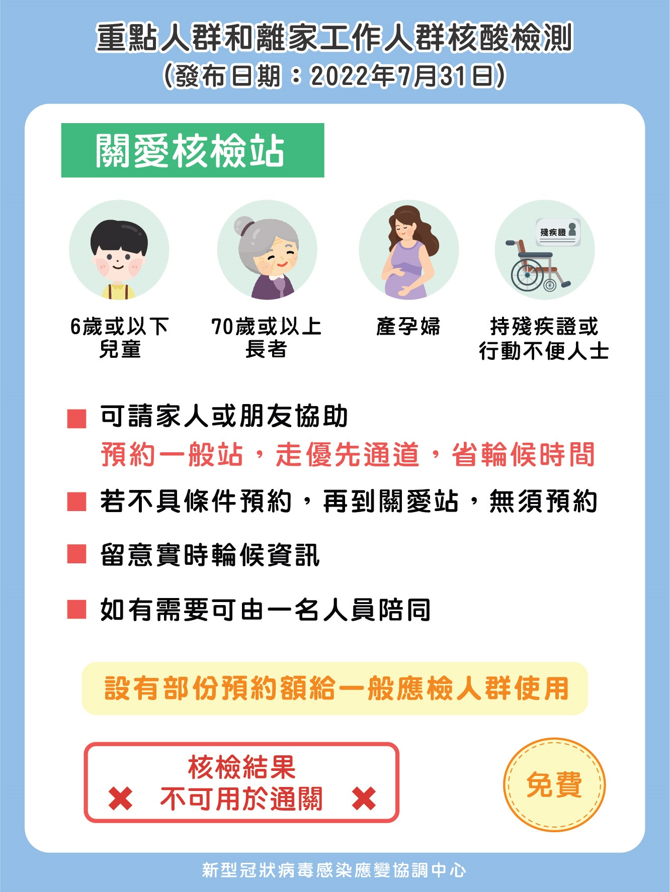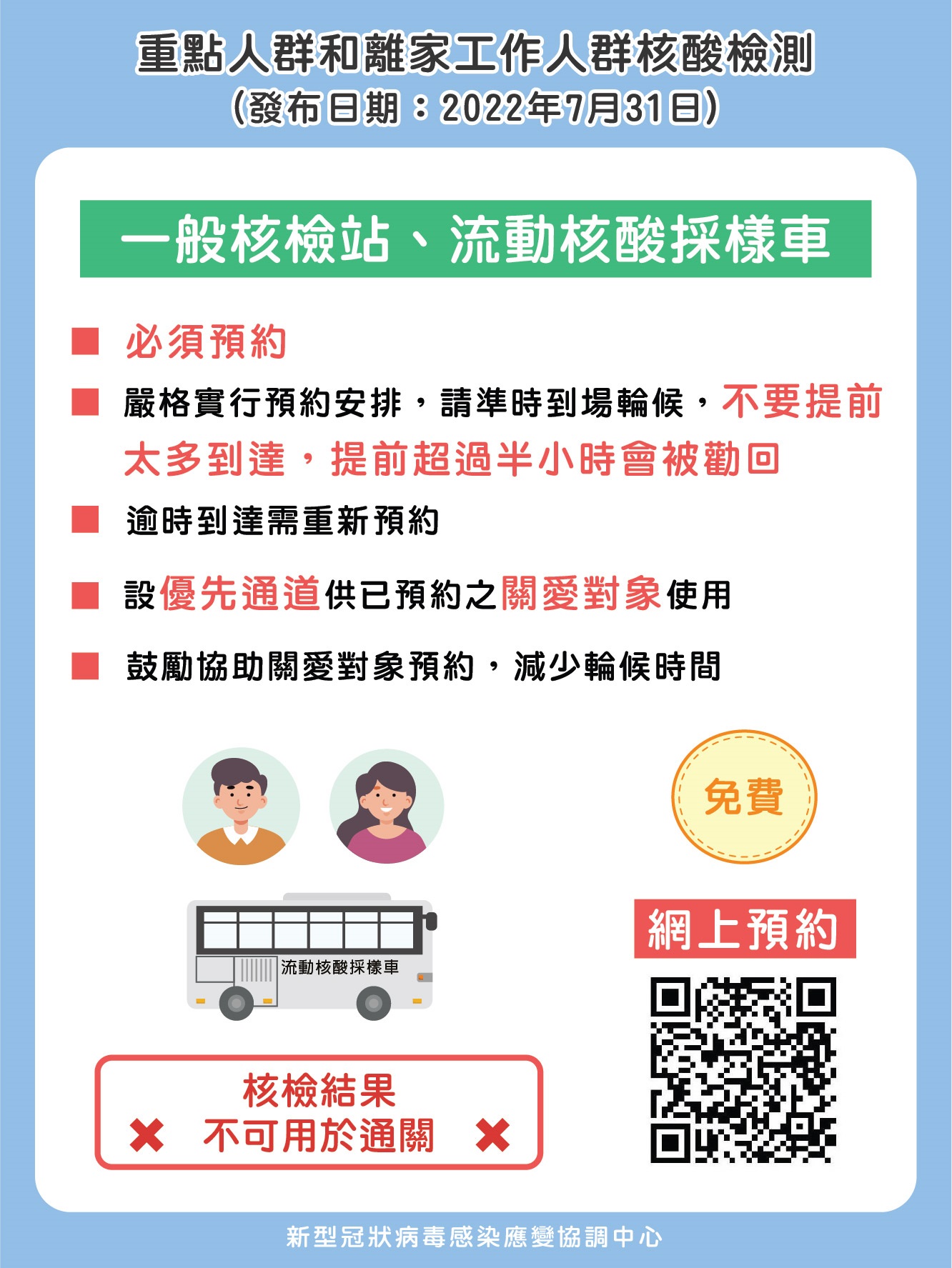 應變協調中心提醒,核檢要求不作為上班前檢查的條件,亦鼓勵僱主酌情允許員工於辦公時間內盡快完成核檢以助分流,但僱主或工作單位應蒐集和確認員工有分別進行24小時(重點人群)或48小時(離家工作人群)內的採樣。