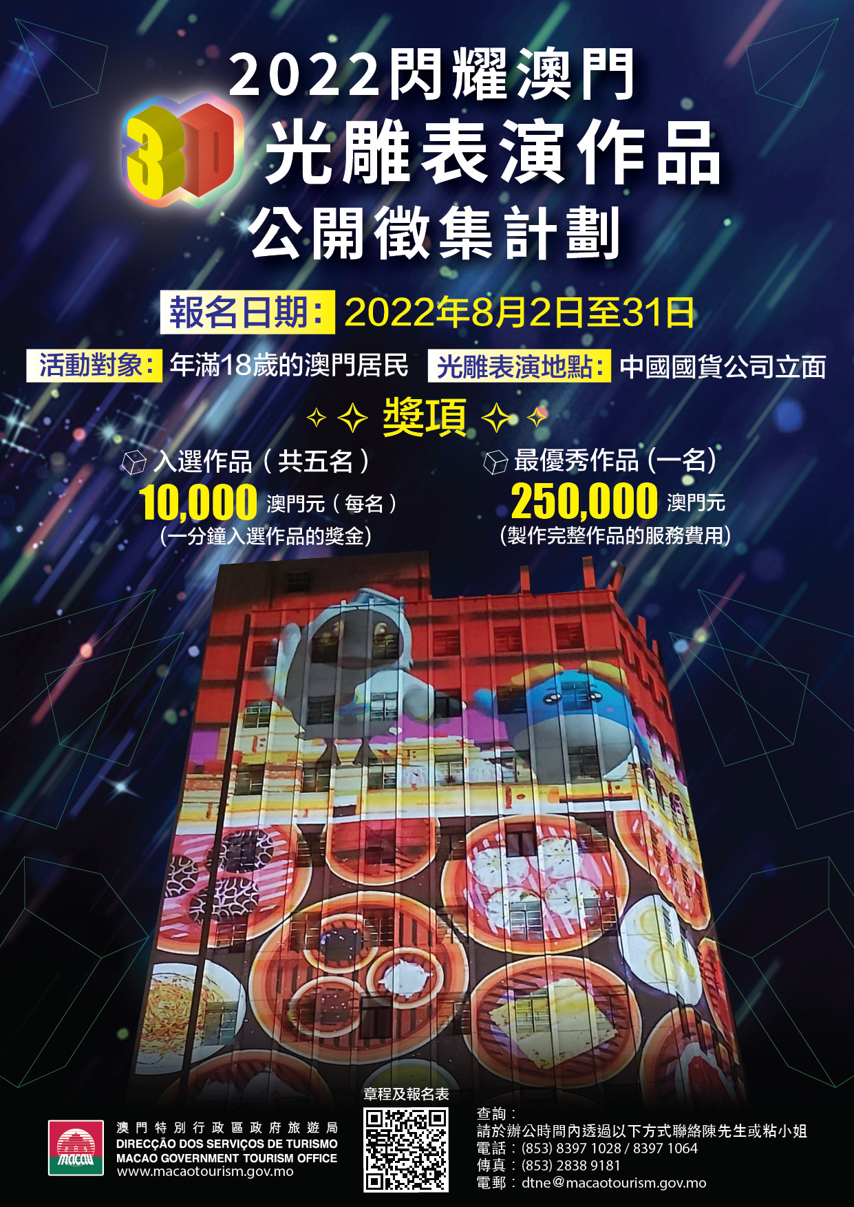 “2022閃耀澳門 – 3D光雕表演作品公開徵集計劃”於2022年8月2日至31日接受報名,有意參加者請透過線上報名及提交作品,詳情可於明(8月2日)起瀏覽旅遊局的澳門旅遊業界網站:https://industry.macaotourism.gov.mo。評選結果將在旅遊局網站公佈。