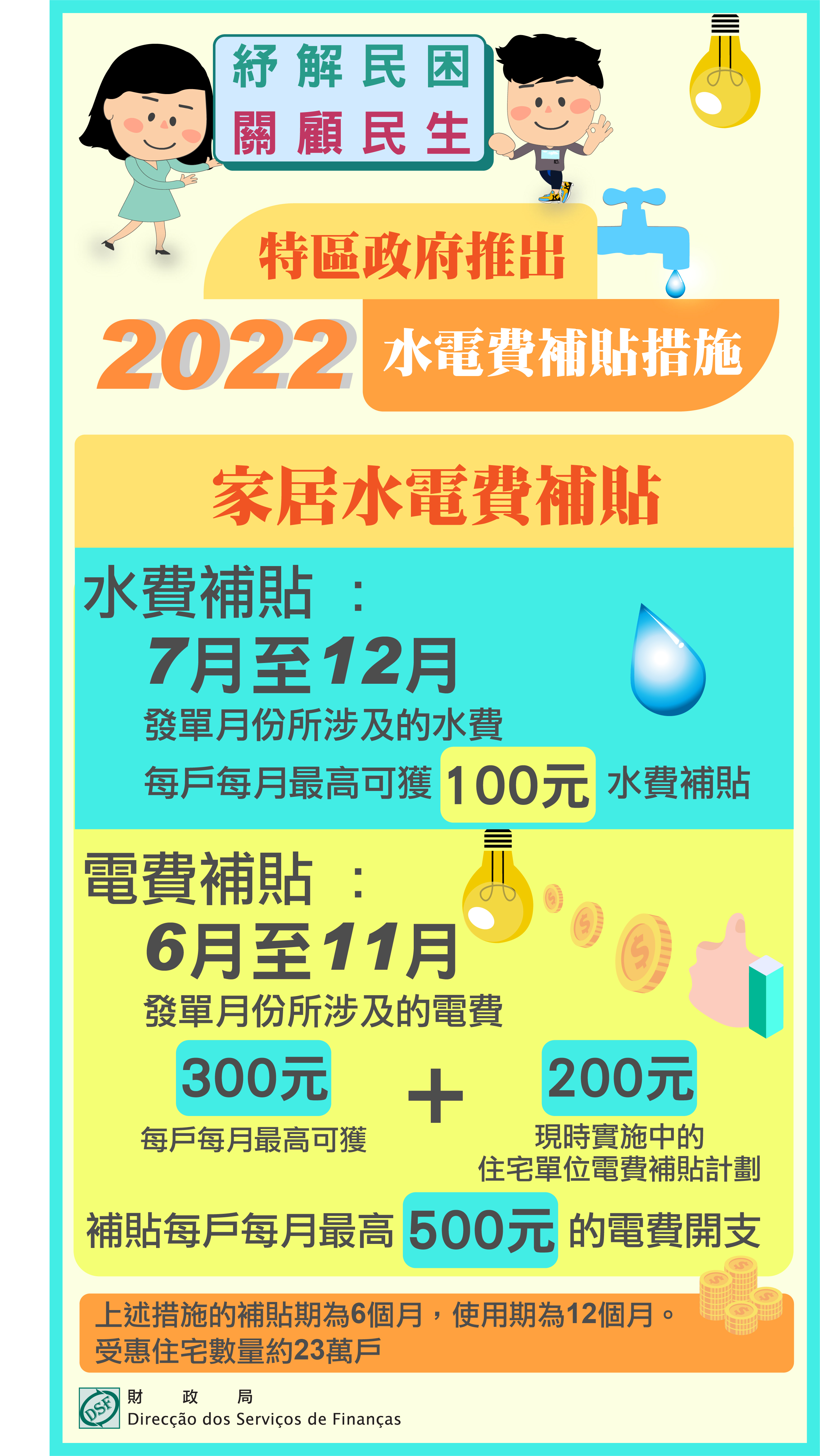 為紓緩新冠肺炎疫情對民生和經濟的影響,特區政府早前公佈的“2022家居及企業商號水電費補貼措施”已於6月起實施。家居及企業商號用戶請留意發單月份為6月份的電費單以及7月份的水費單(第四期繳費通知單),水電費補貼會從發單月份所涉及的水電費開支中自動扣除。