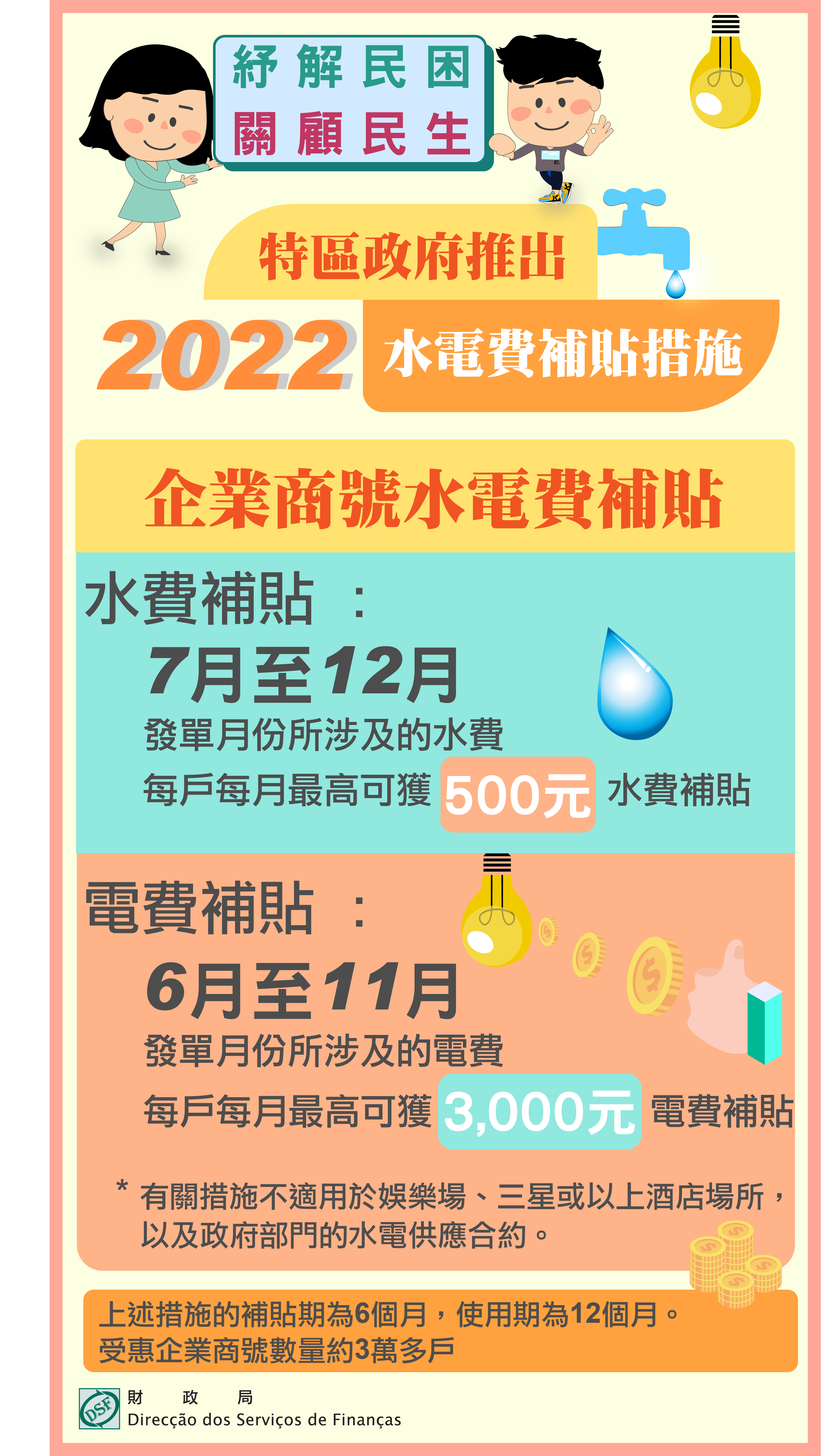 企業商號水電費補貼措施方面,水費補貼措施補貼非住宅用戶本年7至12月發單月份所涉及的水費開支,每戶每月最高500元。電費補貼措施則補貼非住宅用戶本年6至11月發單月份所涉及的電費開支,每戶每月最高3,000元。有關措施不適用於娛樂場、三星或以上酒店場所,以及政府部門的水電供應合約。
