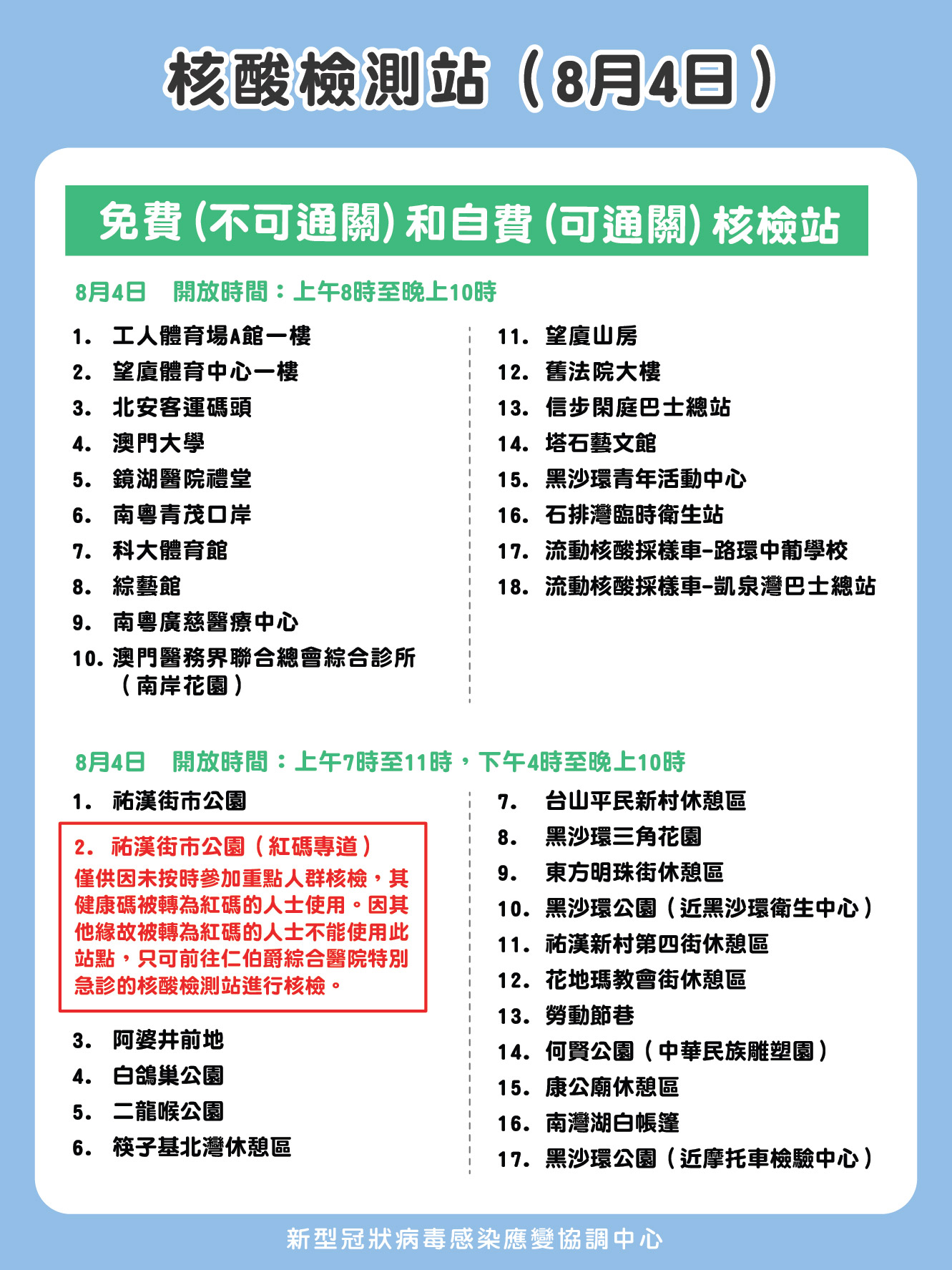 工人體育館A館一樓、望廈體育中心一樓、北安客運碼頭、澳門大學、鏡湖醫院禮堂、南粵青茂口岸、科大體育館、綜藝館、南粵廣慈醫療中心、澳門醫務界聯合總會綜合診所(南岸花園)、望廈山房、舊法院大樓、信步閑庭巴士總站、塔石藝文館、黑沙環青年活動中心、石排灣臨時衛生站,停泊於凱泉灣巴士總站、路環中葡學校的流動核酸採樣車,開放時間為上午8時至晚上10時。