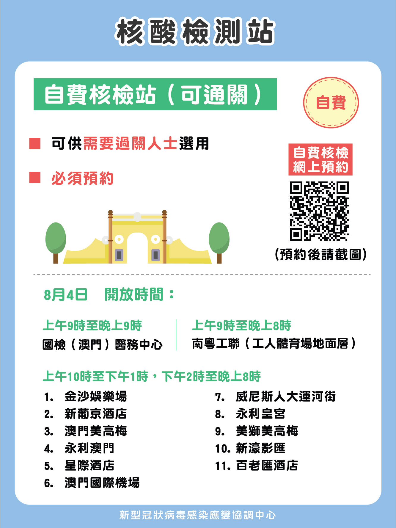 金沙娛樂場、新葡京酒店、澳門美高梅、永利澳門、星際酒店、澳門國際機場、威尼斯人大運河街、永利皇宮、美獅美高梅、新濠影匯及百老匯酒店核檢站將改回自費核檢站,開放時間為上午10時至下午1時,下午2時至晚上8時;國檢(澳門)醫務中心的開放時間為上午9時至晚上9時;南粵工聯(工人體育館地面層)的開放時間為上午9時至晚上8時。