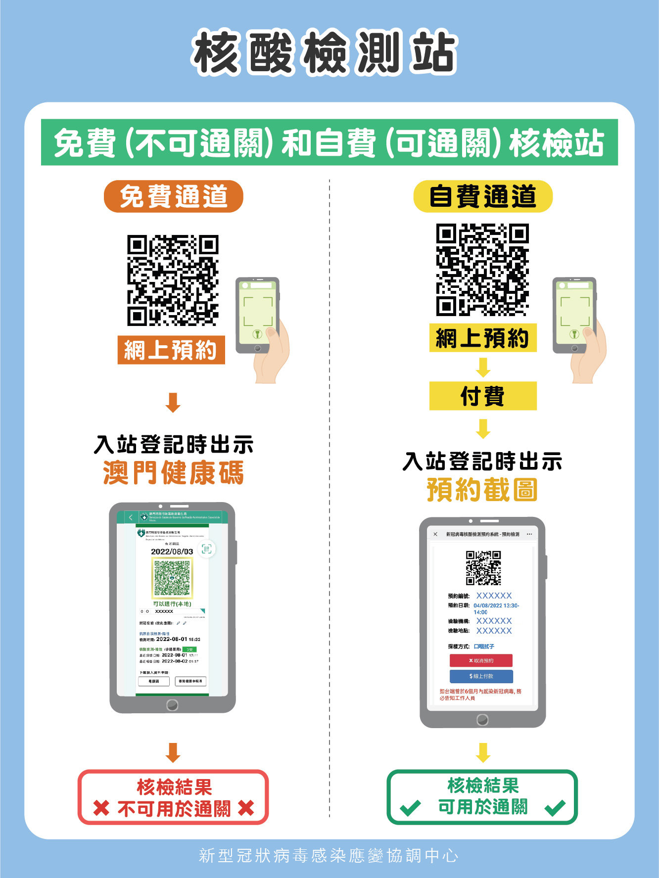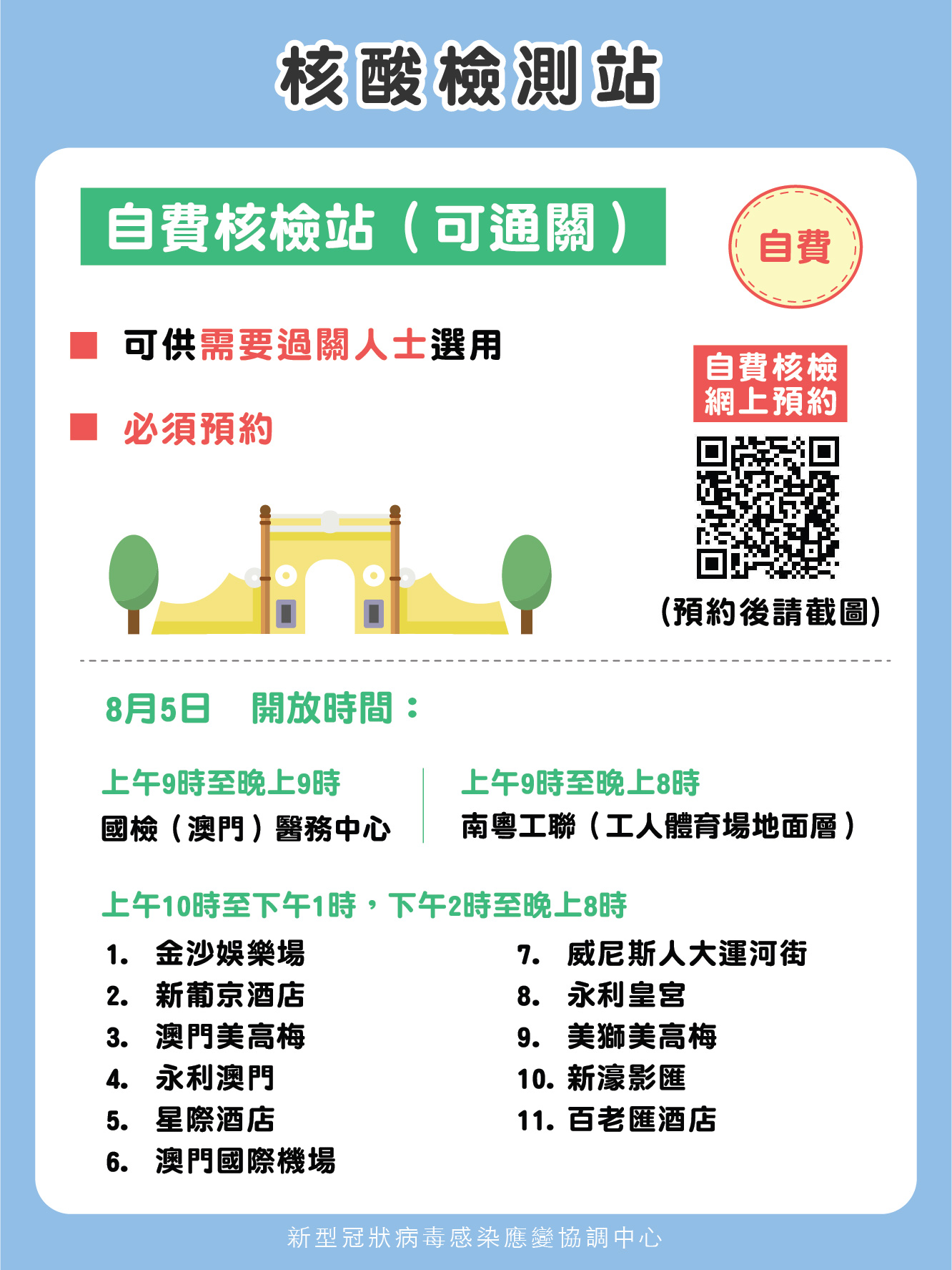 2. 自費核檢站預約連結為https://eservice.ssm.gov.mo/rnatestbook/V21/或https://app.ssm.gov.mo/kkhtbook,核檢結果會上載澳門健康碼及可用作通關。