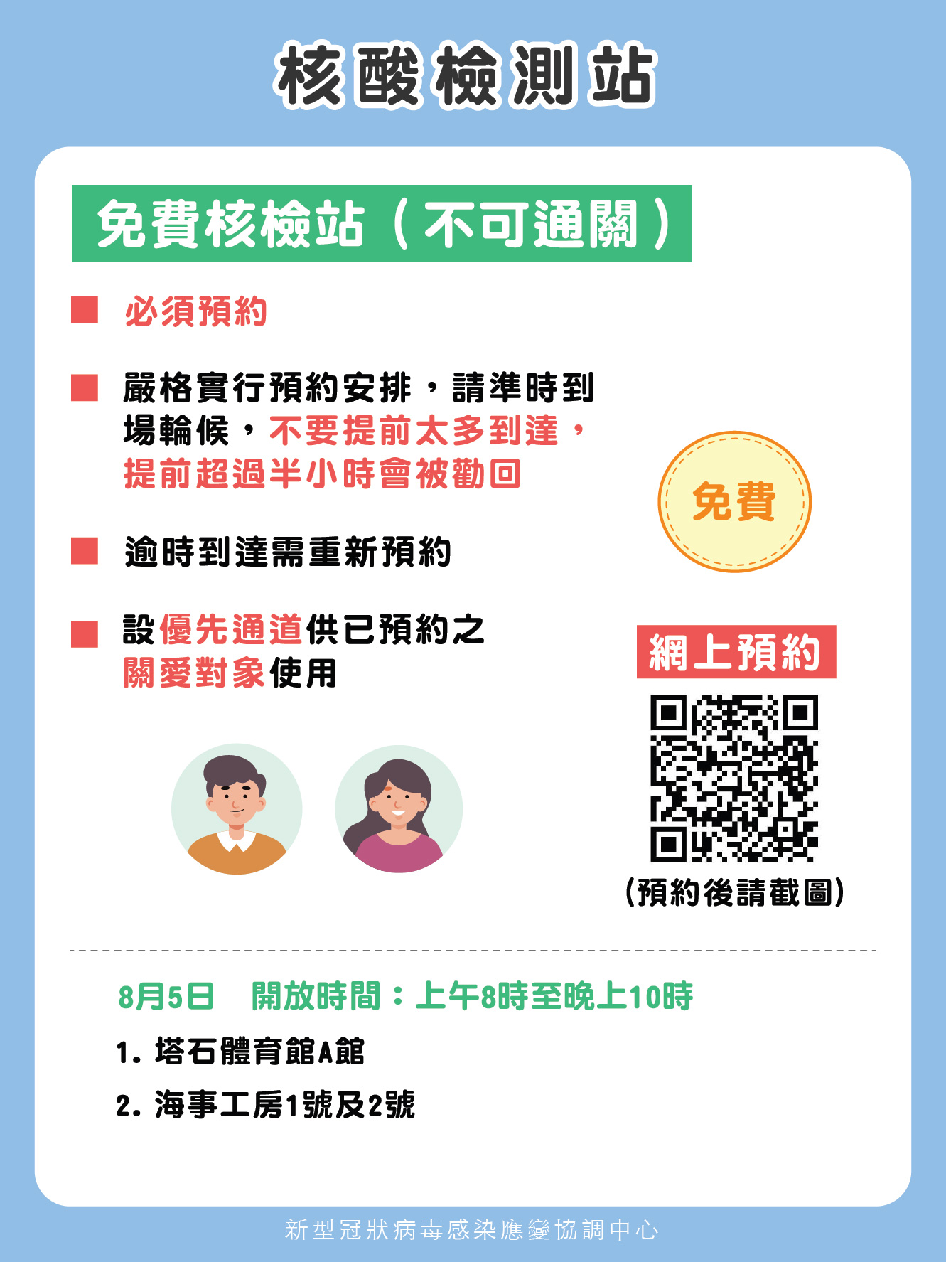 新型冠狀病毒感染應變協調中心表示,為配合各類人群核酸檢測,8月5日調整核酸檢測站安排如下,全部站點必須預約,有需要通關人士可選預約自費核檢站進行核酸檢測,請前往核檢人士留意:
