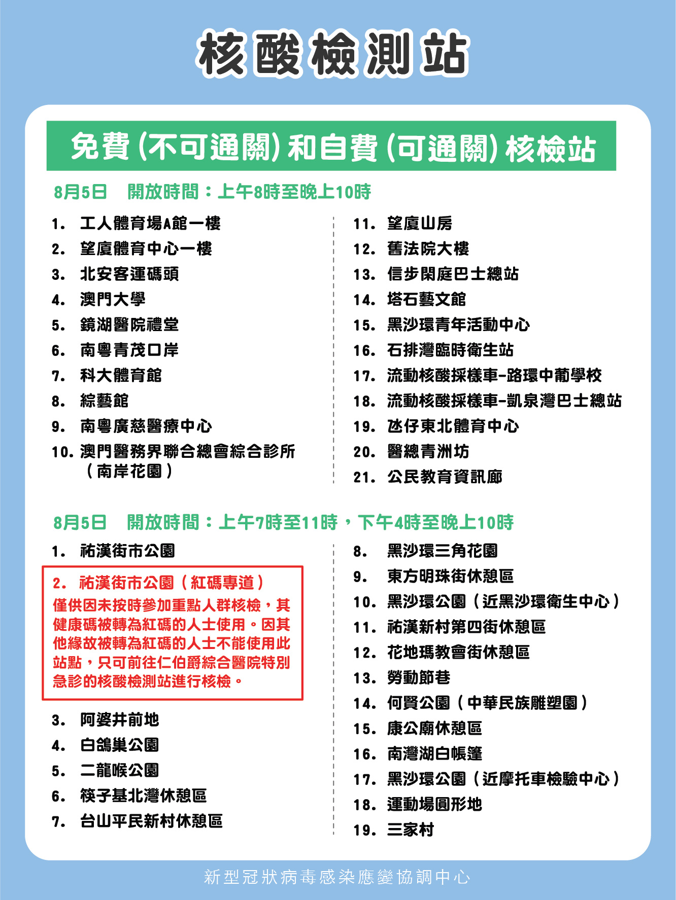 工人體育館A館一樓、望廈體育中心一樓、北安客運碼頭、澳門大學、鏡湖醫院禮堂、南粵青茂口岸、科大體育館、綜藝館、南粵廣慈醫療中心、澳門醫務界聯合總會綜合診所(南岸花園)、望廈山房、舊法院大樓、信步閑庭巴士總站、塔石藝文館、黑沙環青年活動中心、石排灣臨時衛生站、流動核酸採樣車-路環中葡學、流動核酸採樣車-凱泉灣巴士總站。