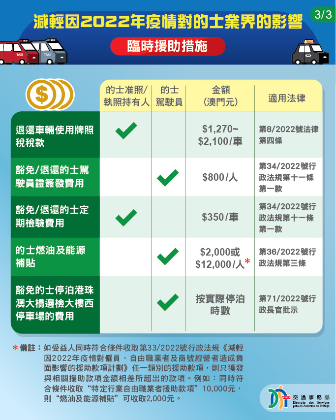 本輪疫情至今,特區政府已先後向的士駕駛員及的士執照持有人推出:退還2022年度輕型出租汽車車輛使用牌照稅稅款、豁免或退還2022年度的士駕駛員證簽發及的士定期檢驗費用,以及豁免的士停泊港珠澳大橋邊檢大樓西停車場的費用至今年年底。