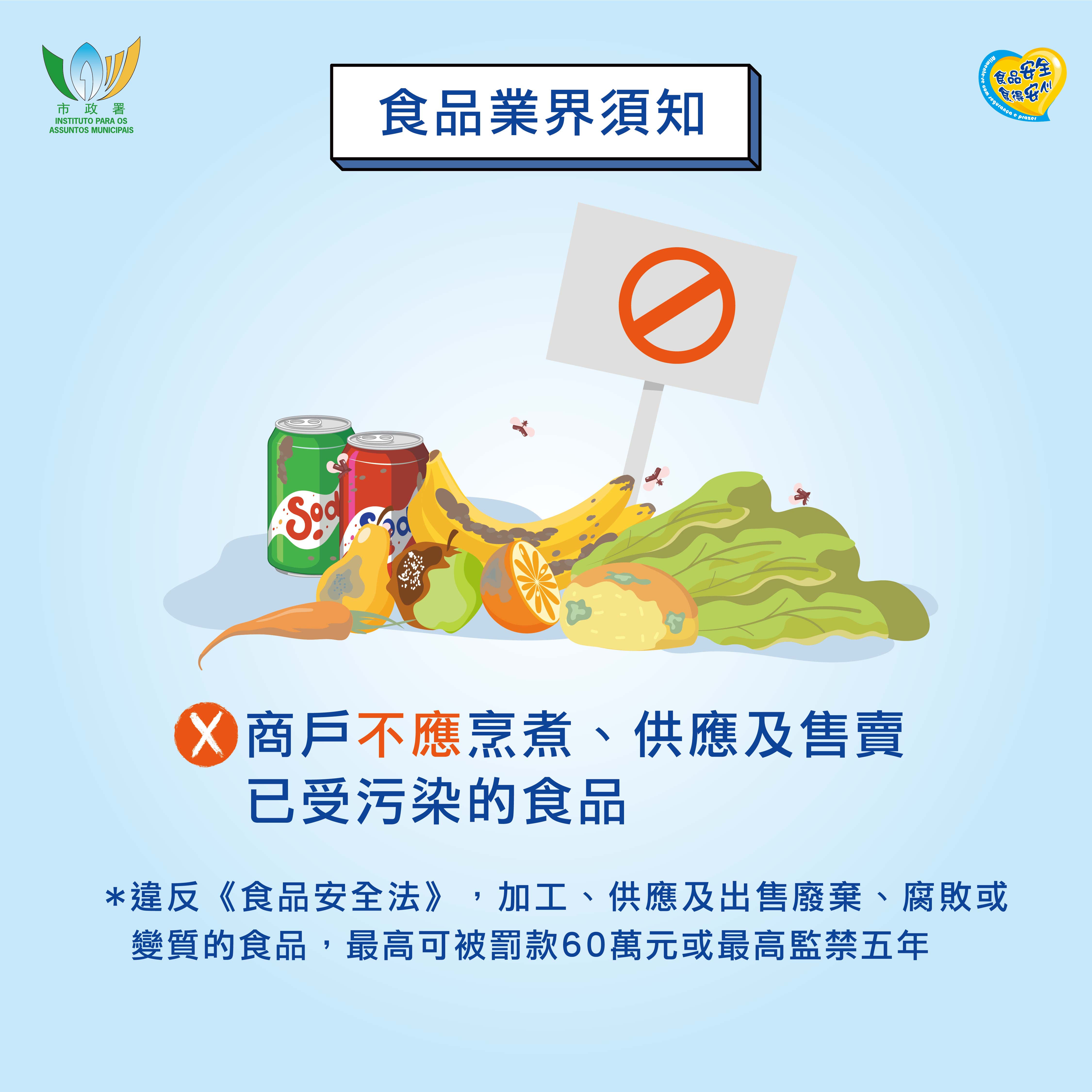 如任何人士繼續加工、供應及出售廢棄、腐敗或變質的食品予他人食用,會觸犯《食品安全法》,最高可被罰款六十萬澳門元或監禁五年。如發現有關行為可致電市政署食安專線2833 8181舉報。