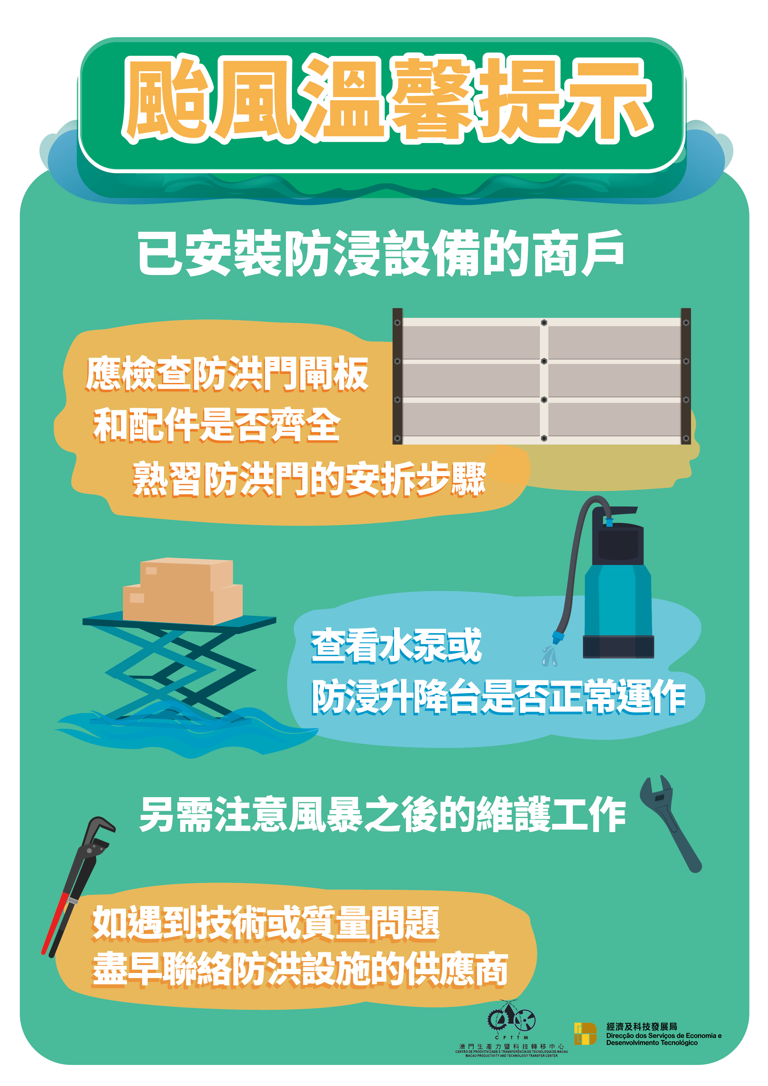 經濟及科技發展局與澳門生產力暨科技轉移中心提醒企業,特別位處低窪地區的商戶,應做好防風防洪防浸的準備工作及預防措施,以免造成貨物及設備損失。同時,商戶應密切留意氣象局發佈的最新天氣情況。